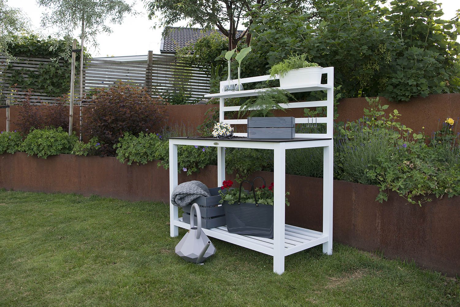 En stilren arbetsbänk i vit aluminium, vit hylla samt gråmelerad bänkskiva.