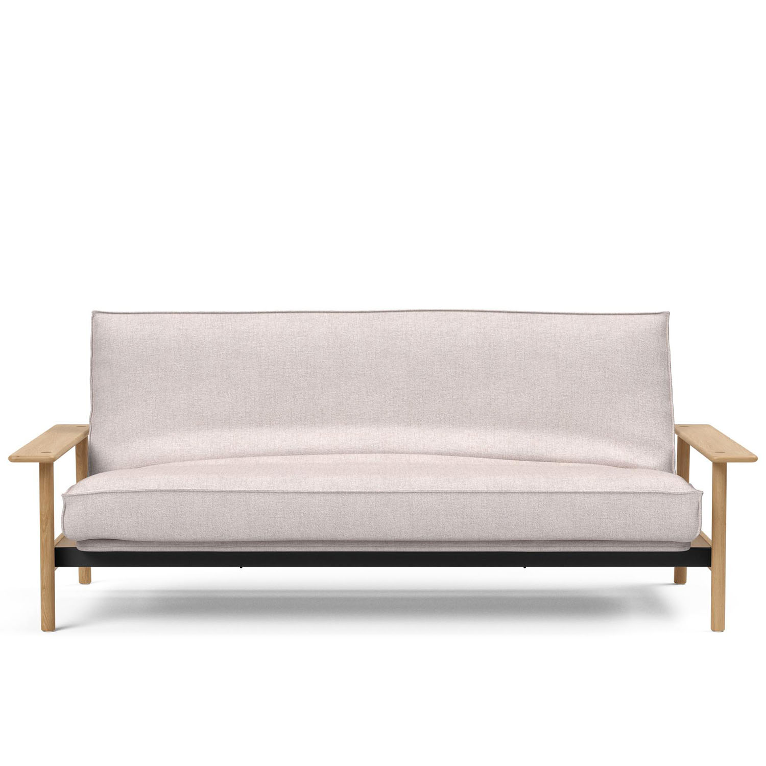 Här visas Balder multifunktions bäddsoffa med madrass med avtagbart tyg. Soffans ram är tillverkad i stål med ribbor i björkträ som täcks med ett överdrag i tyg. Soffans ben och armstöd är i lackerad ek.