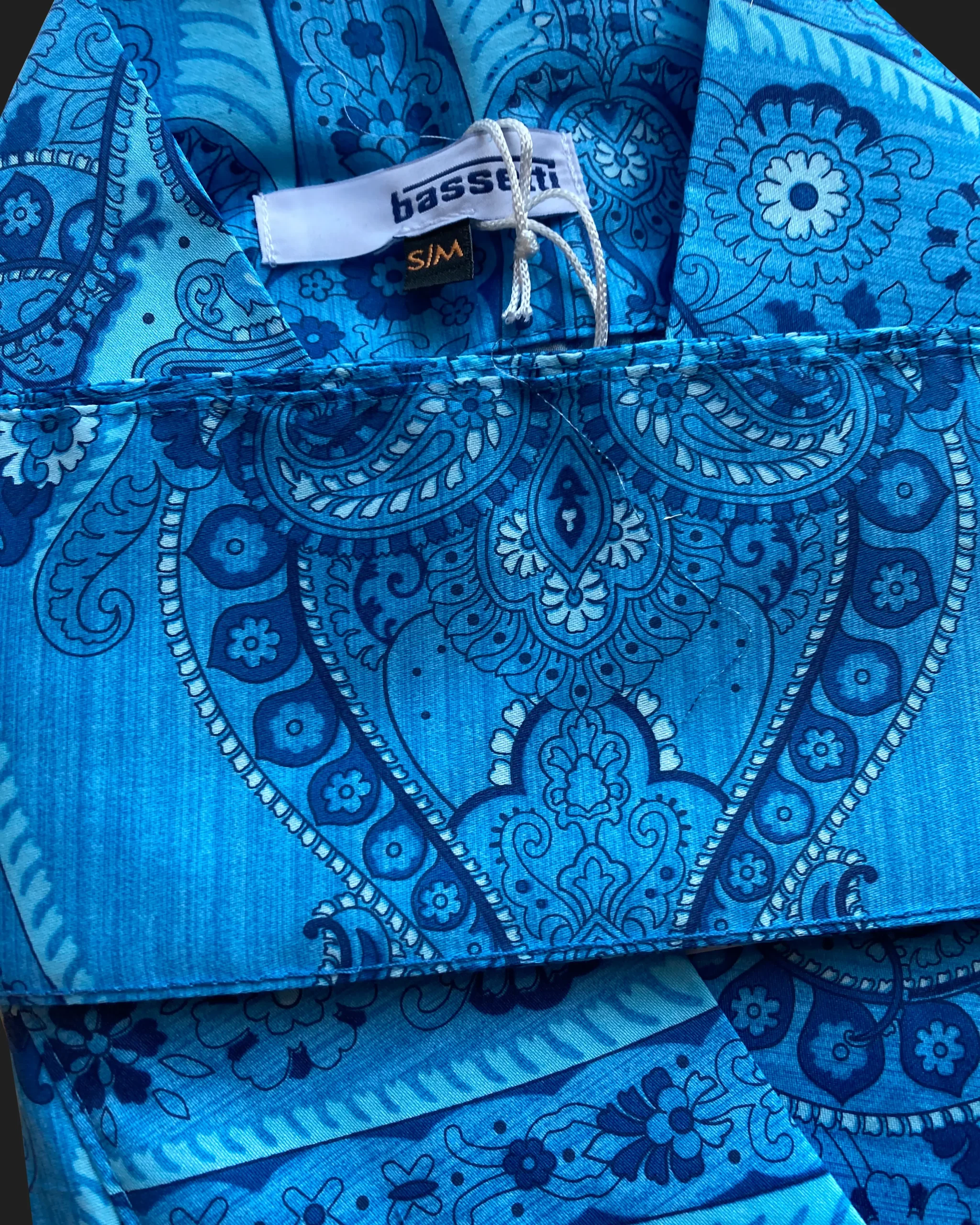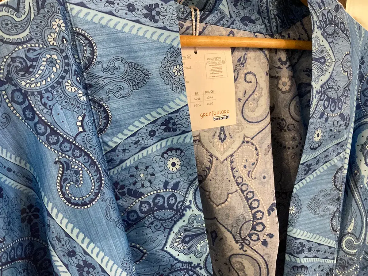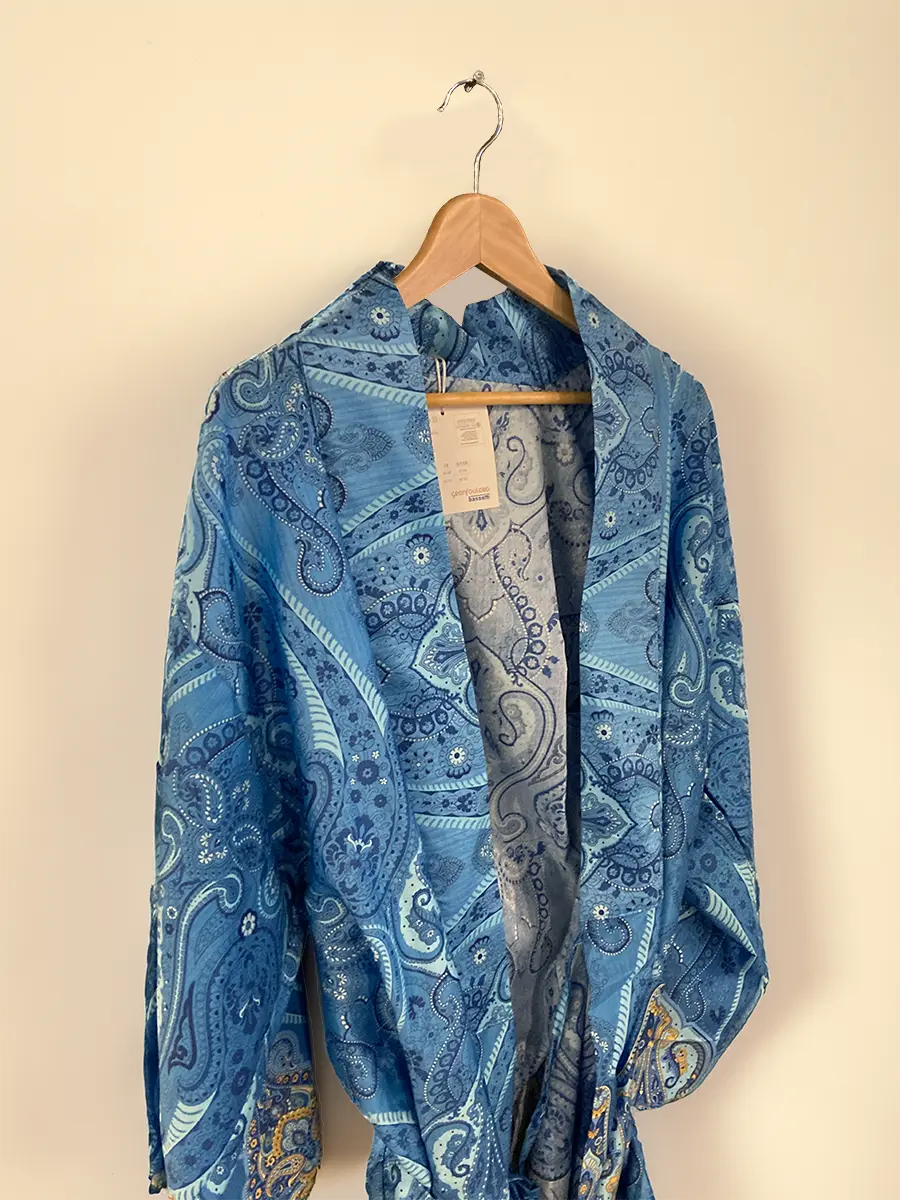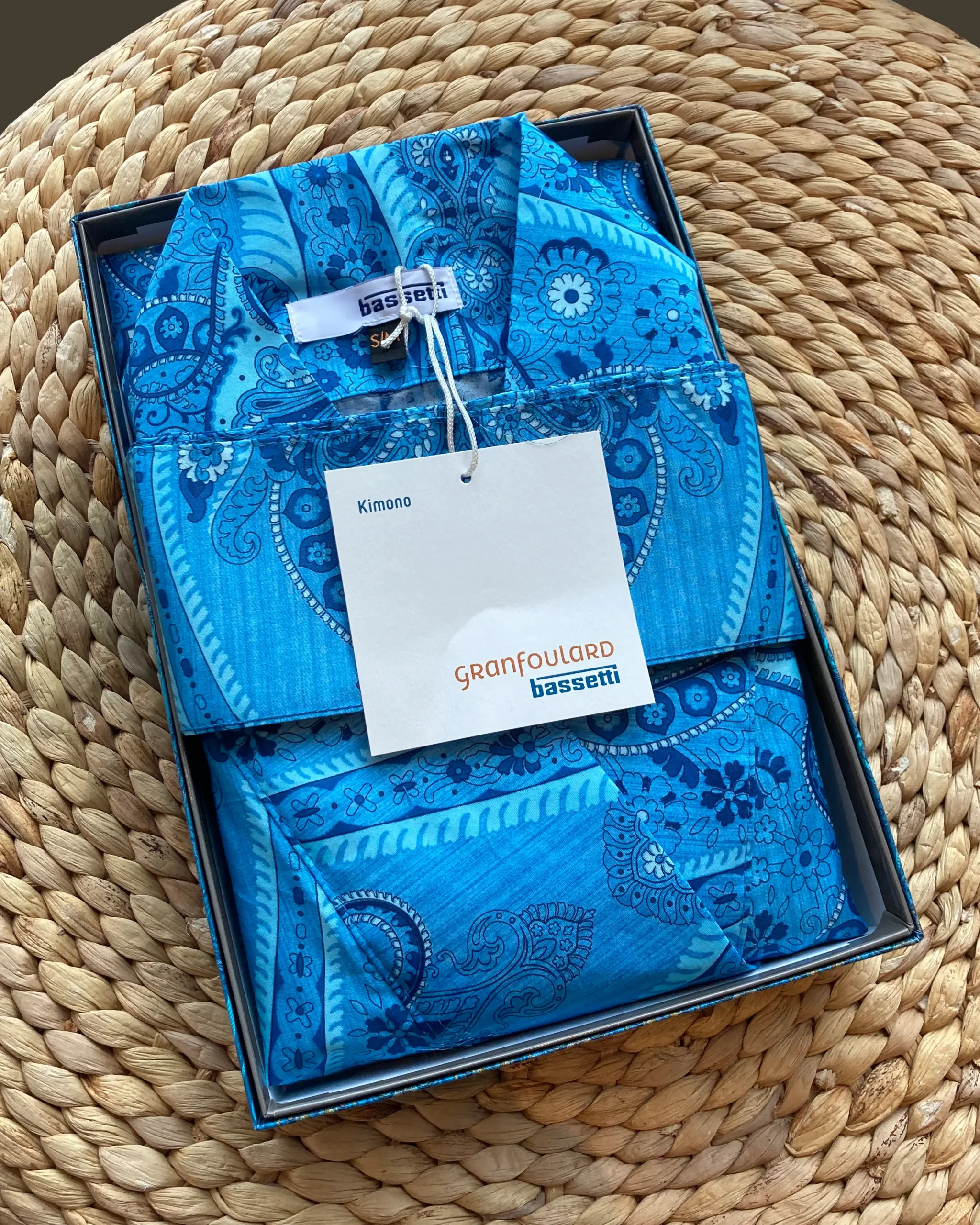 Bassetti Ragusa kimono från italienska Bassetti Granfoulard, ett varumärke med textilier i exklusiva tyger i vackra mönster. Denna morgonrock är i extra fin bomullssatin med 110 trådar per cm², vilket ger in silkesmjuk känsla. Kimonon visas här i mönstret Ragusa i klarblått.