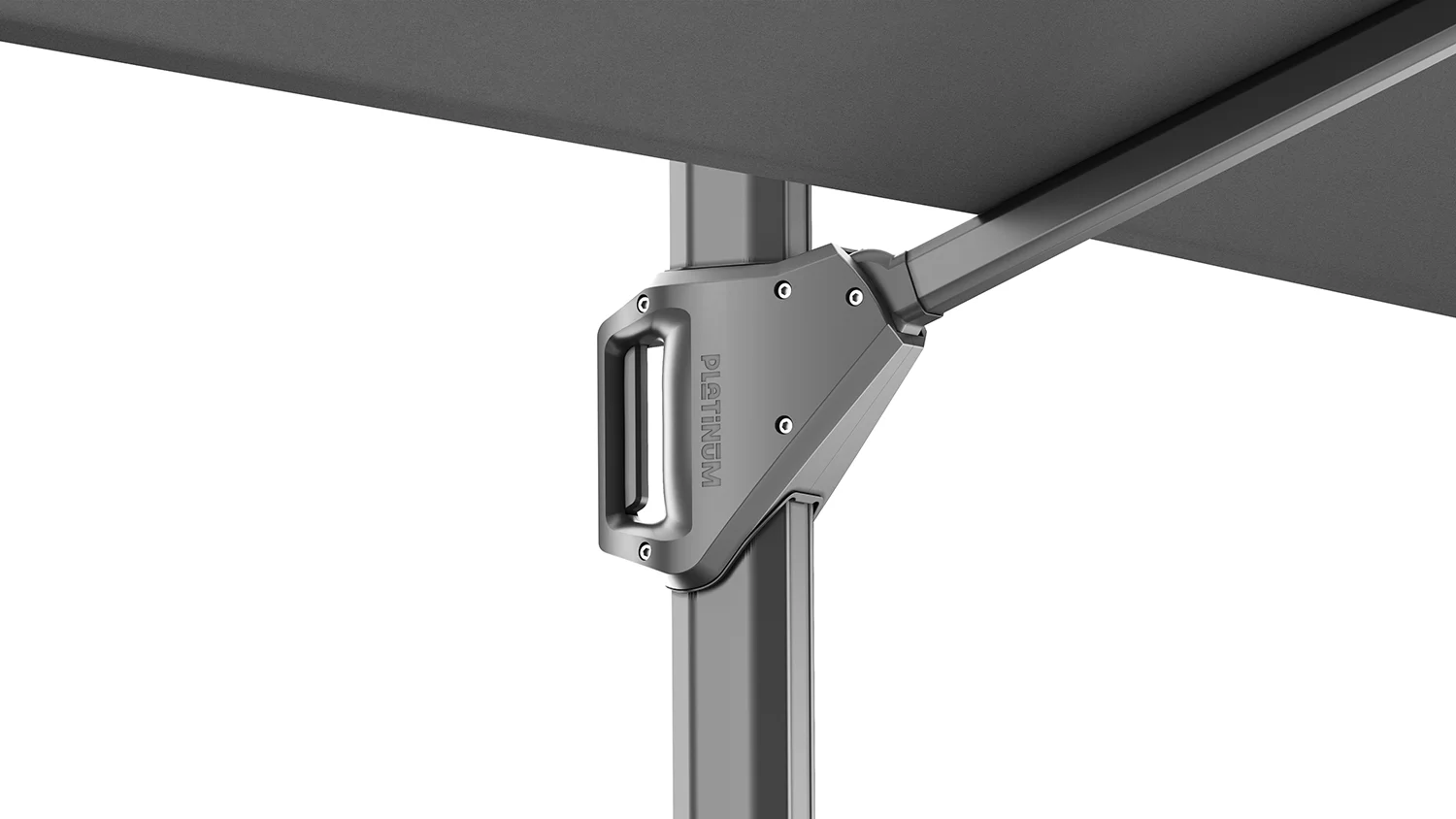 Parasollet levereras utan bas eller fotkryss. Parasollet kräver en parasollfotsvikt minst 120 kg. Vi rekommenderar att du placerar detta parasoll på en parasollfot från Platinum Sun & Shade. Dessa är försedda med hjul så att parasollet är lätt att flytta. Platinum Sun & Shade erbjuder även In-Ground parasollfötter som kan grävas ner eller gjutas fast i marken. Detta ger dig mer utrymme på din uteplats.