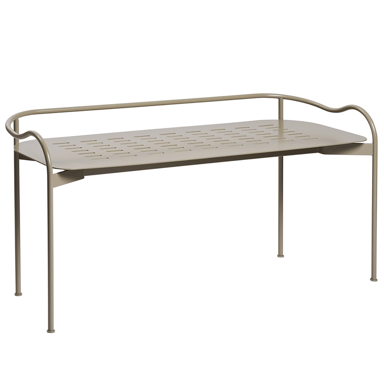 En nätt, tvåsitsig, bänk med ett lågt räcke i tråd.  Stommen och sits är i metall och har lackats med en slät pulverlack. Sitsen är snyggt perforerad för att vatten lätt ska rinna av.