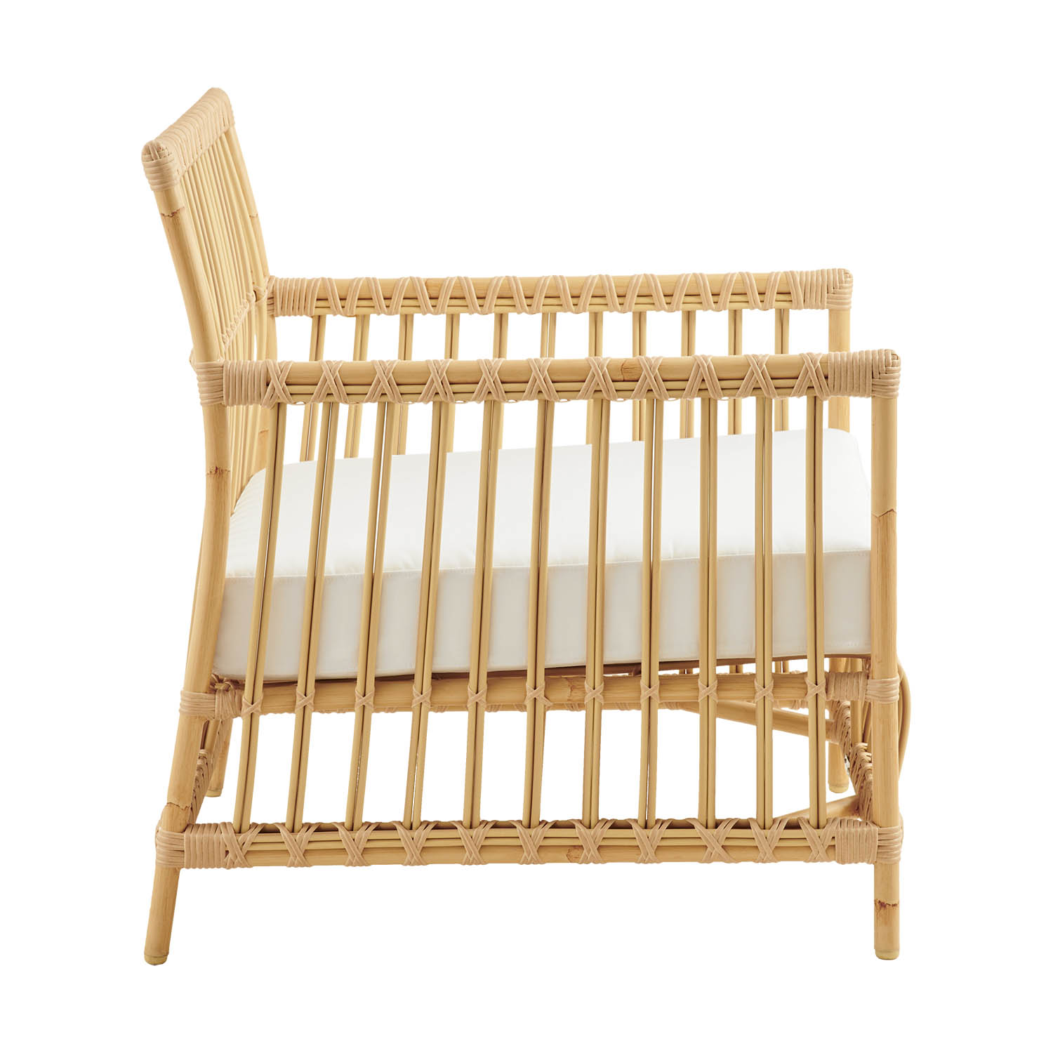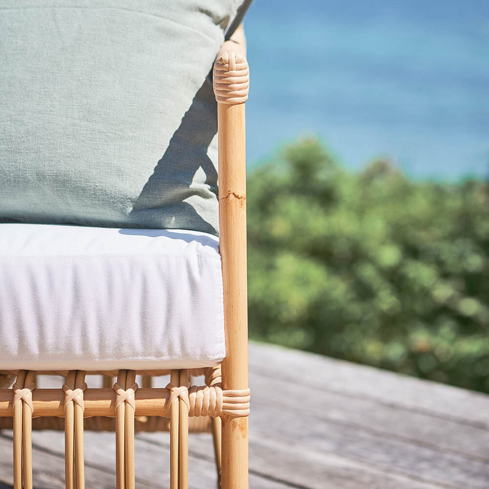 Caroline fåtölj tillverkades ursprungligen i rotting för inomhus. Fåtöljen finns nu i aluminium/konstrotting för utomhusbruk.