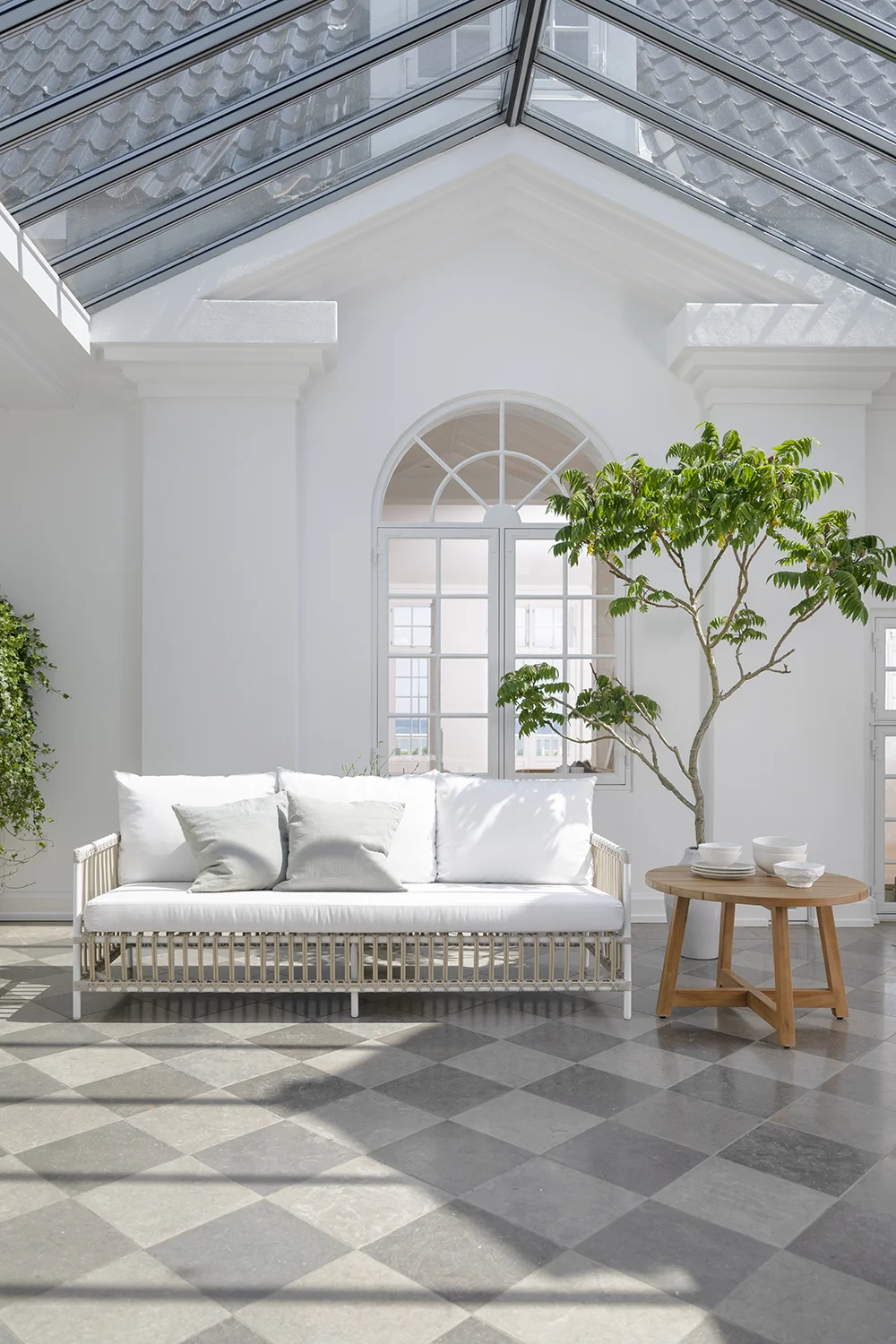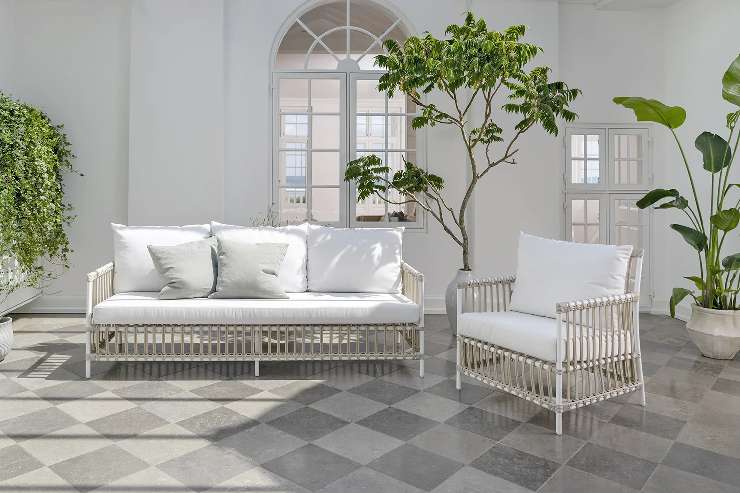 Caroline soffa tillverkades ursprungligen i rotting för inomhus. Soffan finns nu i vitlackad aluminium och beige konstrotting för utomhusbruk.