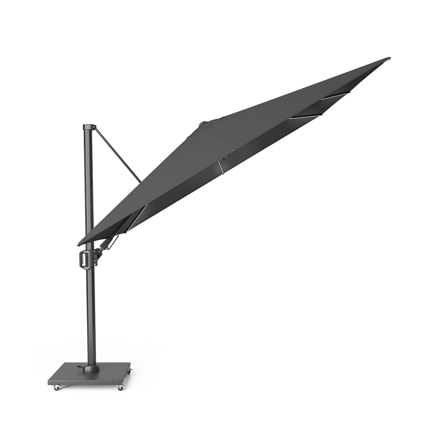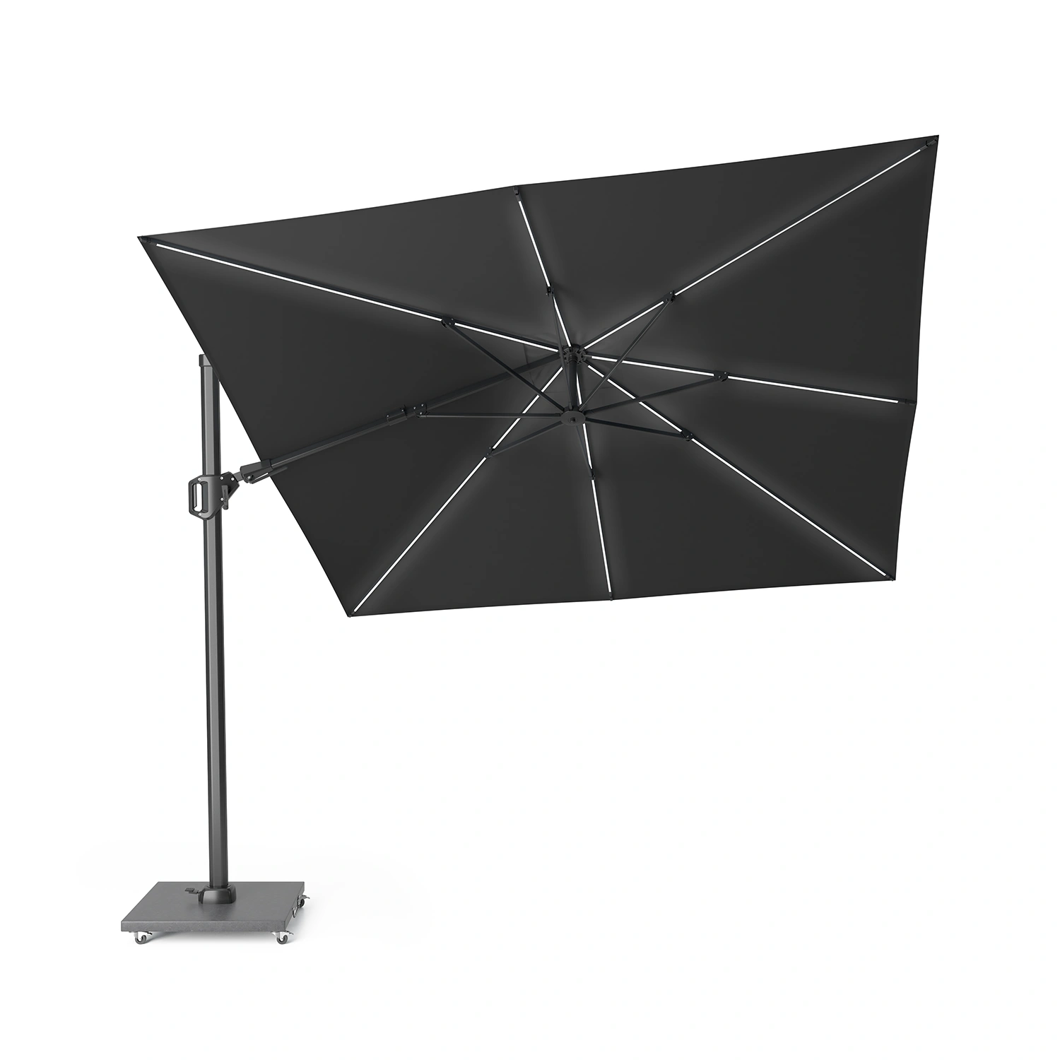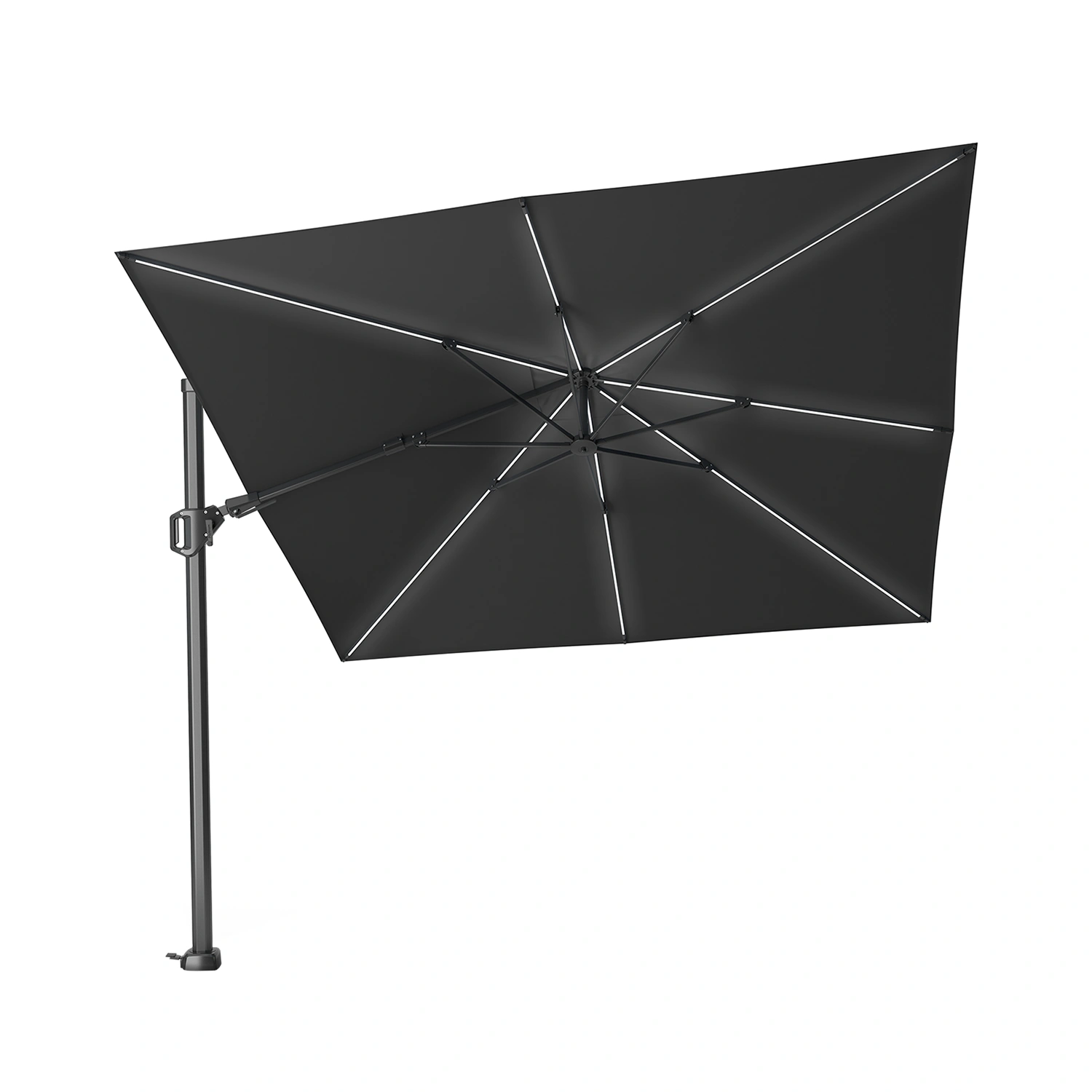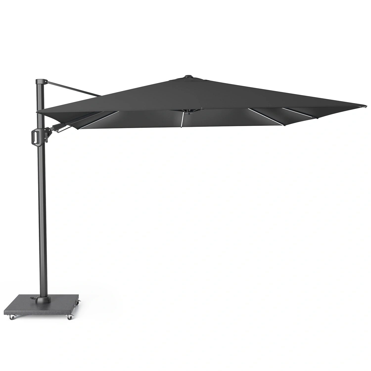 Platinum Sun & Shade frihängande parasoll Challenger T² Glow med pulverlackerat aluminiumstativ i antracitgrått och premium parasollduk i färgen Faded Black. Ljuset kan lysa både upp och ner, ger en känsla av lyx och är lätt att hantera sladdlöst. Under dagen ger skugga hela dagen utan att det behöver flyttas tack vare T² bakåt- och sidledslutning och den 360° roterbara basen, och på kvällen skapar den en mysig atmosfär på vilken uteplats som helst tack vare den varmvita LED-belysningen i revbenen.