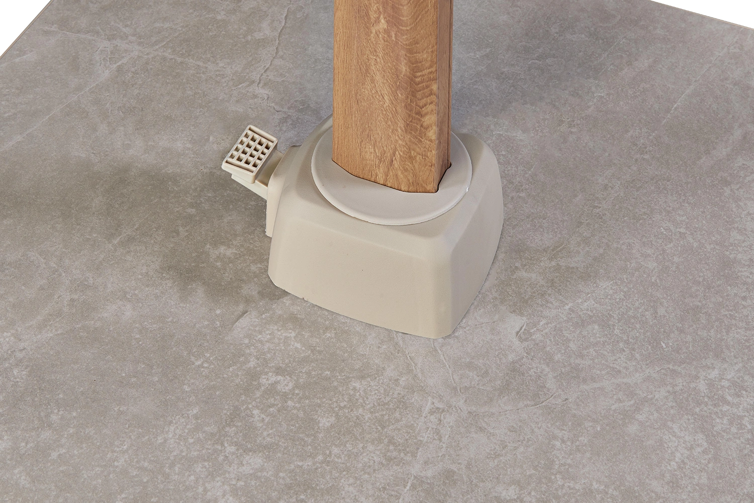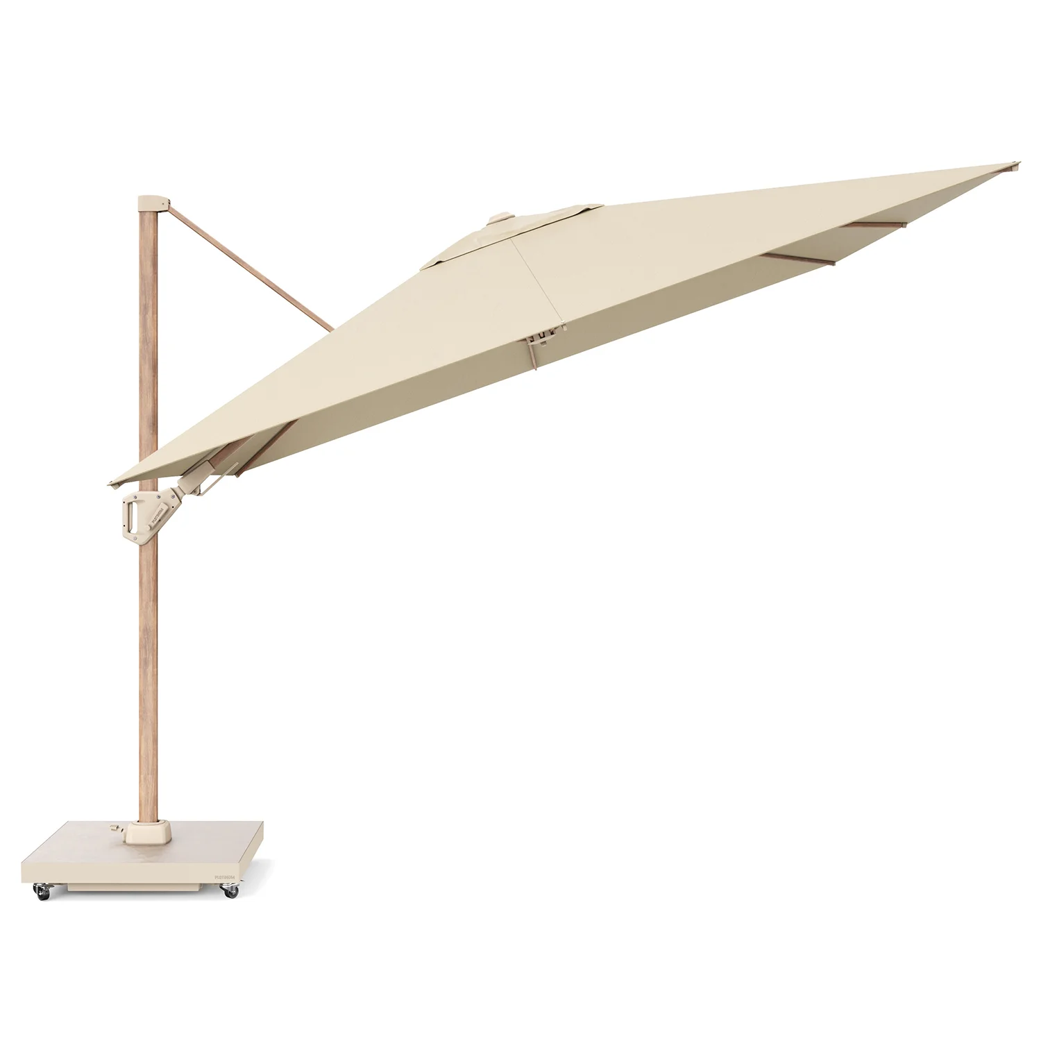 Parasollet levereras utan bas eller fotkryss. Parasollet kräver en parasollfotsvikt minst 90 kg. Vi rekommenderar att du placerar detta parasoll på en parasollfot från Platinum Sun & Shade. Dessa är försedda med hjul så att parasollet är lätt att flytta. Platinum Sun & Shade erbjuder även In-Ground parasollfötter som kan grävas ner eller gjutas fast i marken. Detta ger dig mer utrymme på din uteplats.