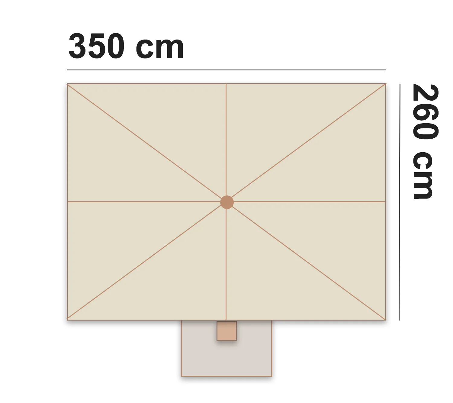Detta parasoll har en rektangulär parasollduk. Kapellet är 350 cm brett och 260 cm djupt.