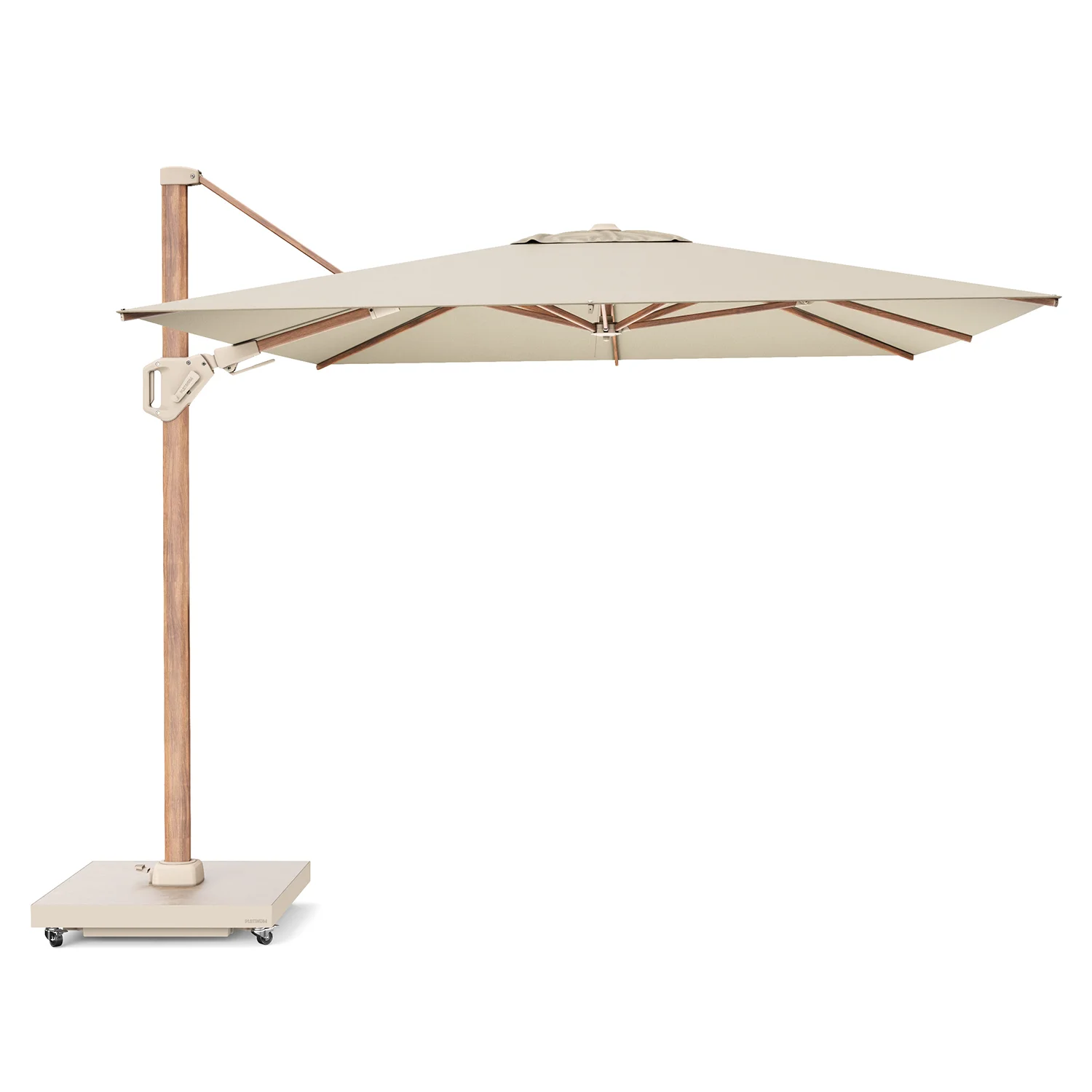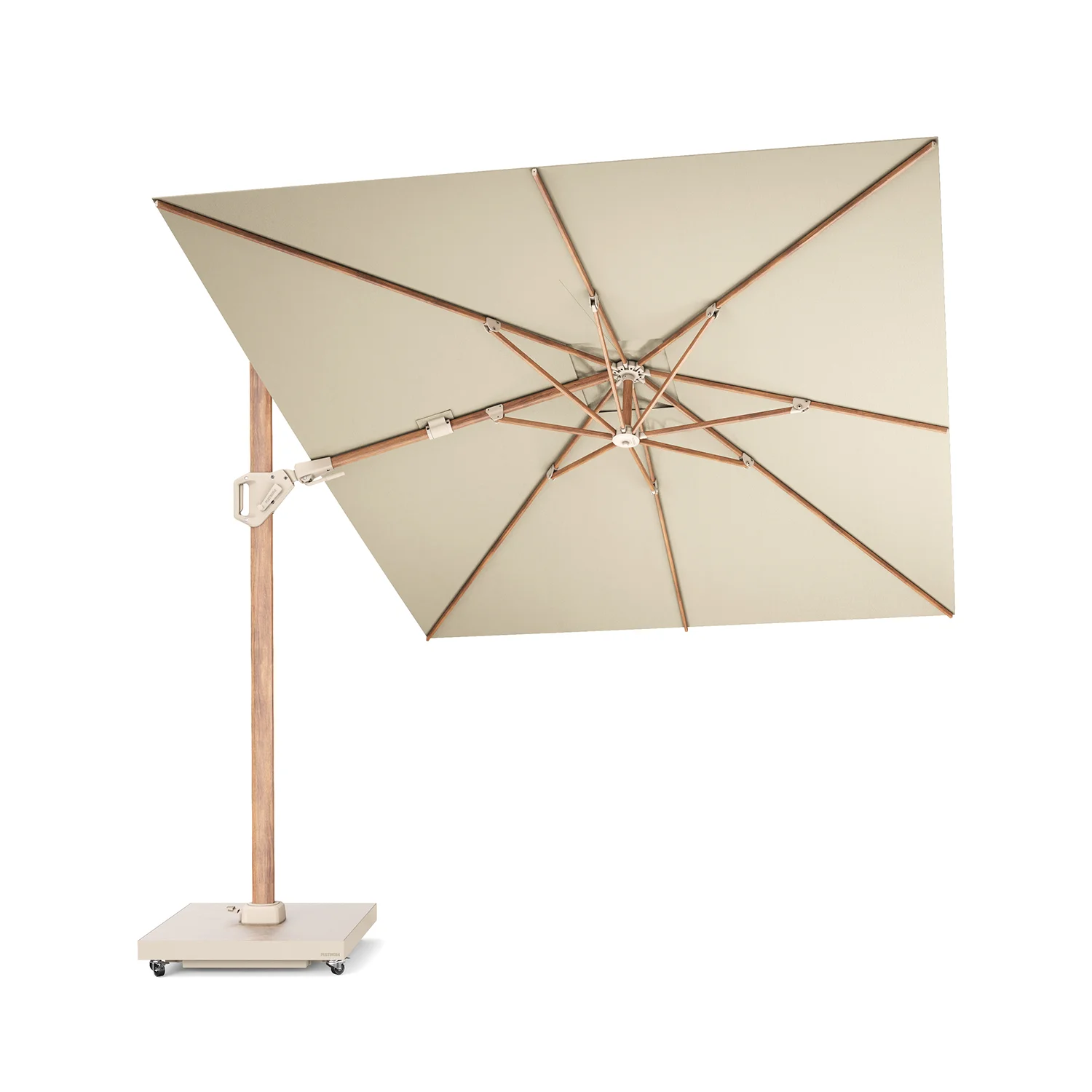 Platinum Sun & Shade frihängande parasoll Challenger T² Premium med aluminiumstativ med Teaklook-print och tyg i färgen Champagne. Challenger T² är det pålitliga flaggskeppet i Platinums parasollsortiment. Challenger T² kan inte bara tiltas fram och tillbaka utan även i sidled. Ger skugga hela dagen utan att parasollet behöver flyttas tack vare av T² bakåt- och sidledstiltningen och den 360° roterbara basen.