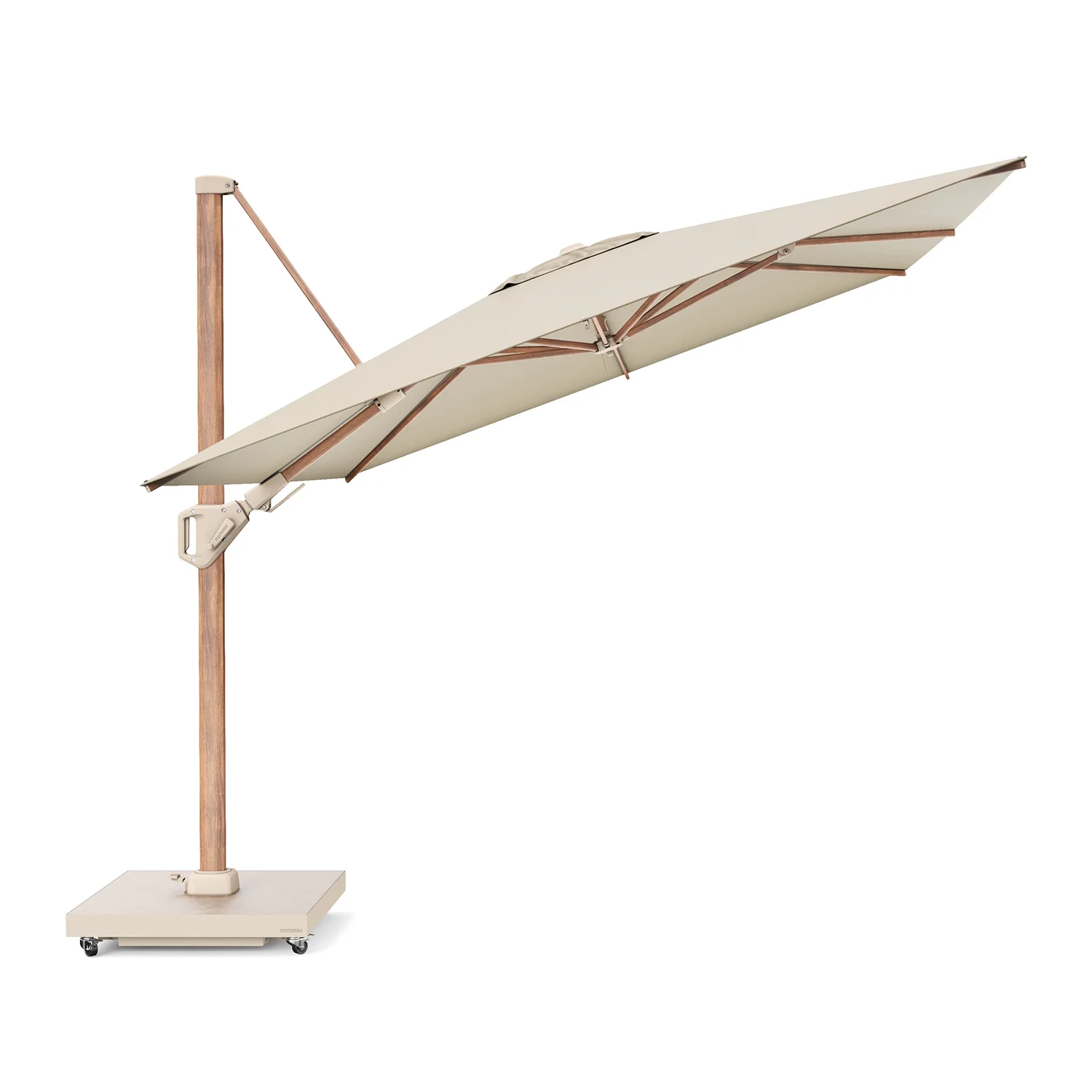 Parasollet levereras utan bas eller fotkryss. Parasollet kräver en parasollfotsvikt minst 90 kg. Vi rekommenderar att du placerar detta parasoll på en parasollfot från Platinum Sun & Shade. Dessa är försedda med hjul så att parasollet är lätt att flytta. Platinum Sun & Shade erbjuder även In-Ground parasollfötter som kan grävas ner eller gjutas fast i marken. Detta ger dig mer utrymme på din uteplats.