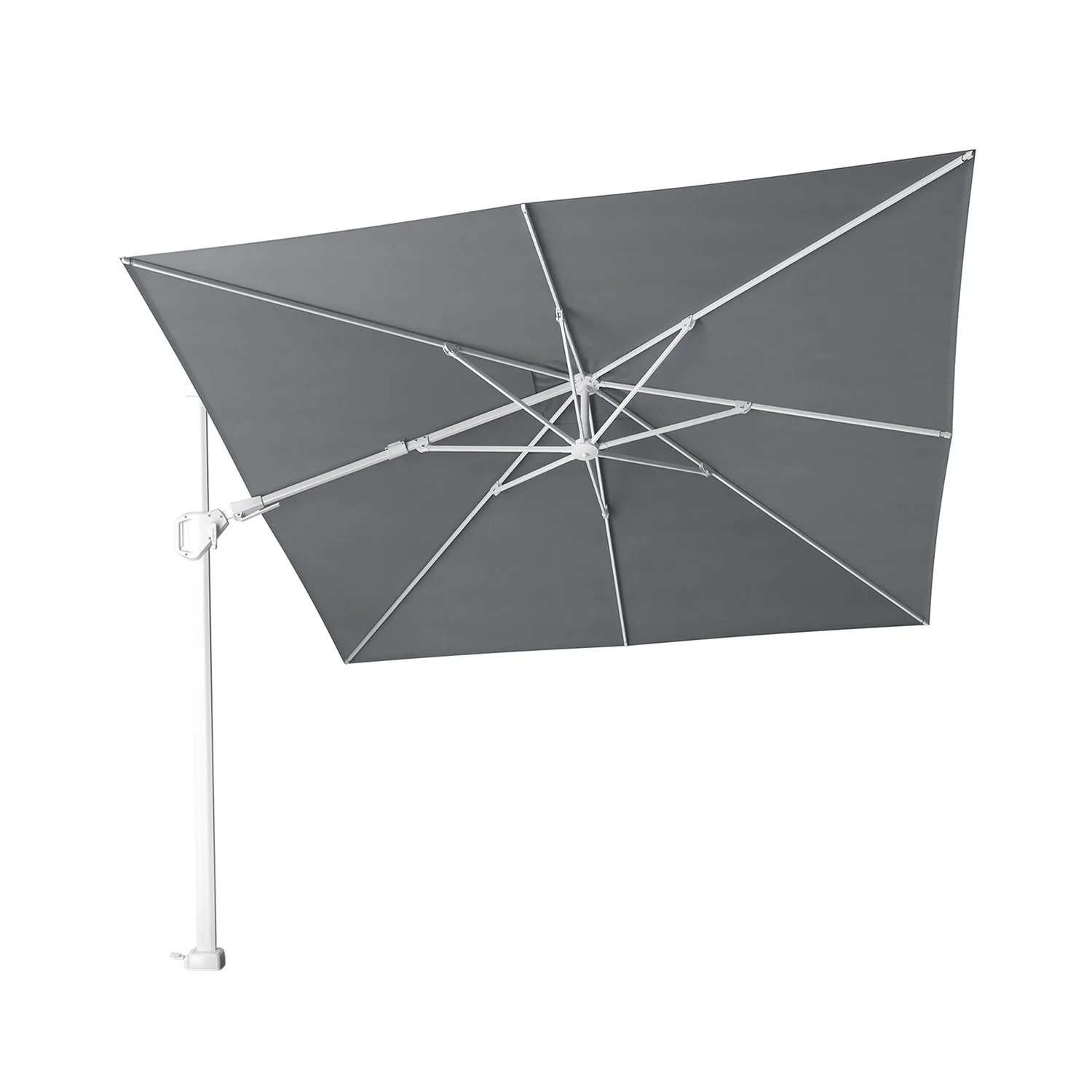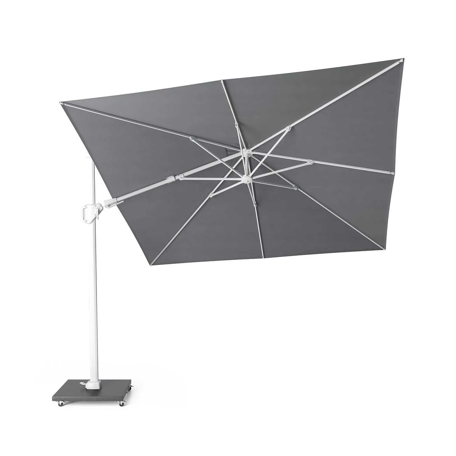 Platinum Sun & Shade frihängande parasoll Challenger T² Premium med vitt pulverlackerat aluminiumstativ och tyg i färgen Manhattan. Challenger T² är det pålitliga flaggskeppet i Platinums parasollsortiment. Challenger T² kan inte bara tiltas fram och tillbaka utan även i sidled. Ger skugga hela dagen utan att parasollet behöver flyttas tack vare av T² bakåt- och sidledstiltningen och den 360° roterbara basen.