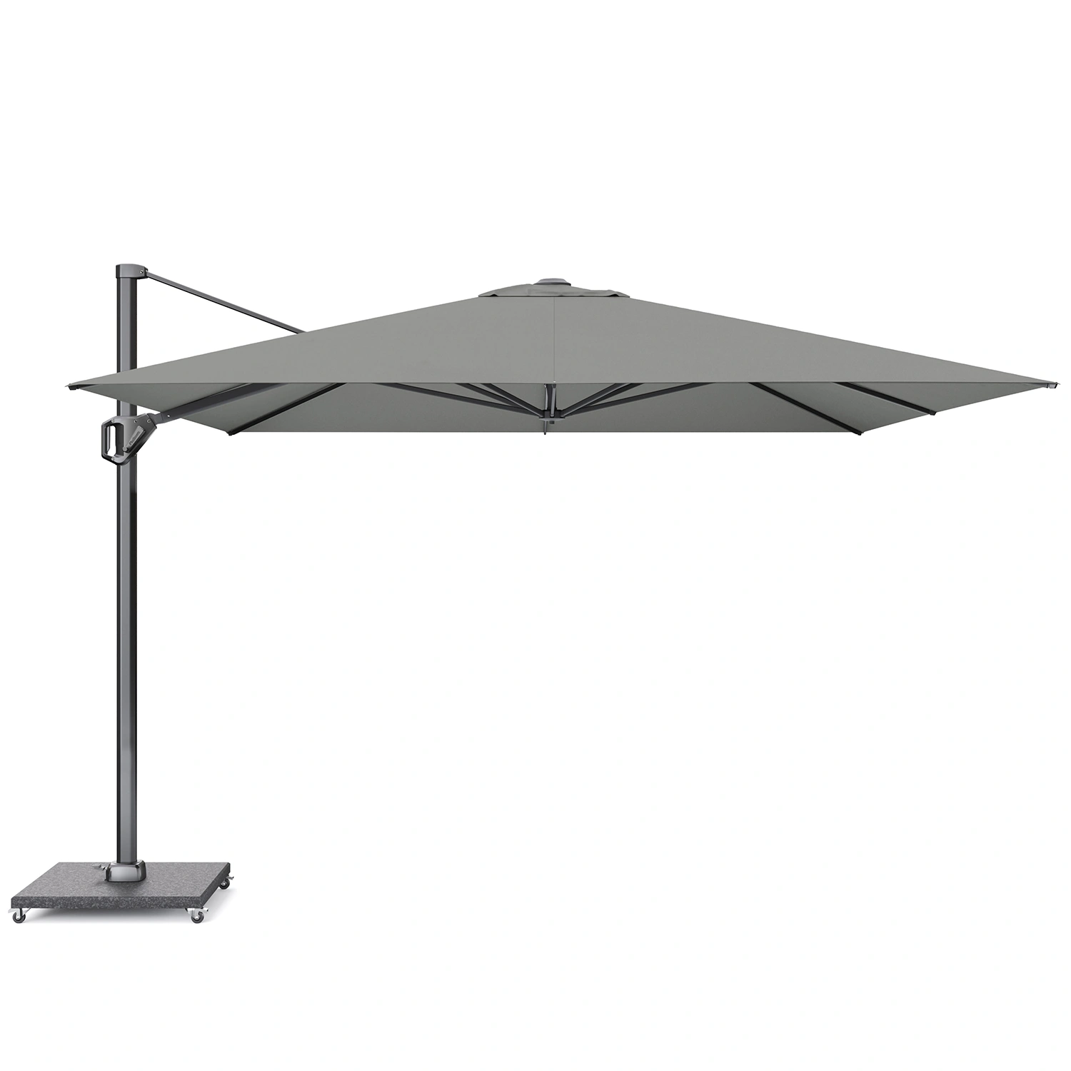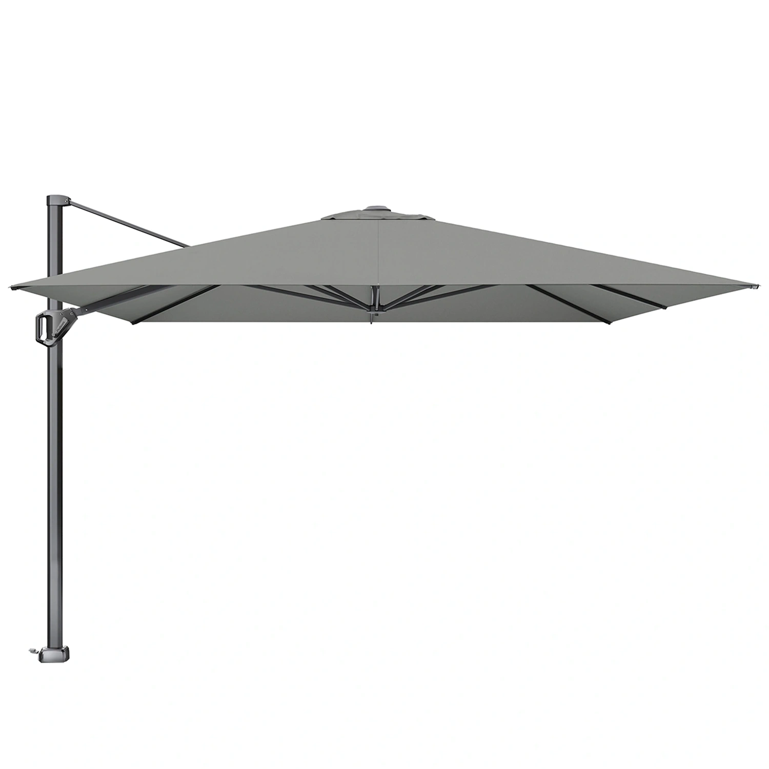 Challenger T¹ frihängande parasoll med stativ i antracitgrå aluminium och Premiumduk i färgen Manhattan. Samtida. Stabil. Lätt att använda. Mycket skugga tack vare bakåtlutning, 360° roterande bas.
