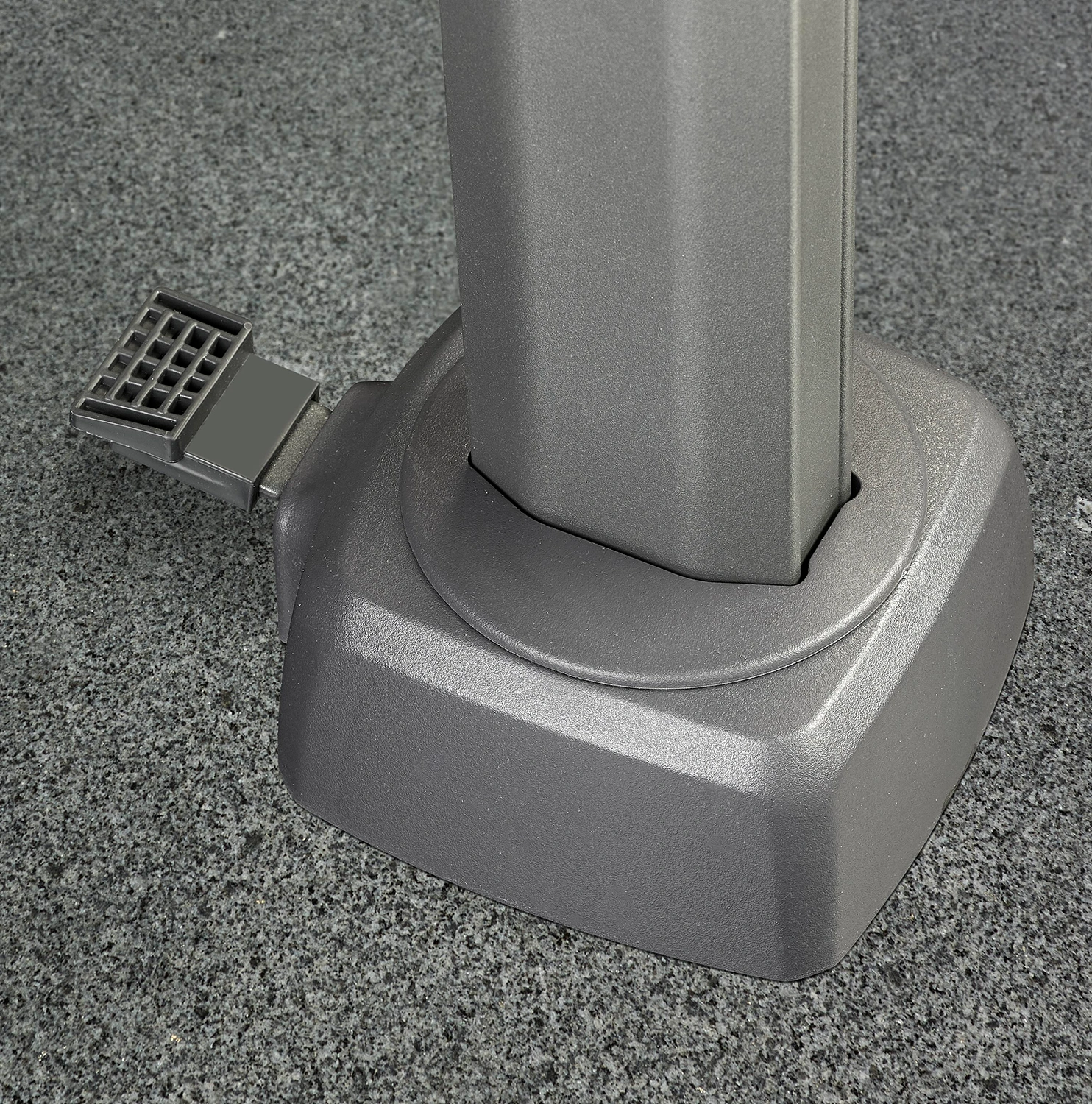 Parasollet levereras utan bas eller fotkryss. Parasollet kräver en parasollfotsvikt minst 120 kg. Vi rekommenderar att du placerar detta parasoll på en parasollfot från Platinum Sun & Shade. Dessa är försedda med hjul så att parasollet är lätt att flytta. Platinum Sun & Shade erbjuder även In-Ground parasollfötter som kan grävas ner eller gjutas fast i marken. Detta ger dig mer utrymme på din uteplats.