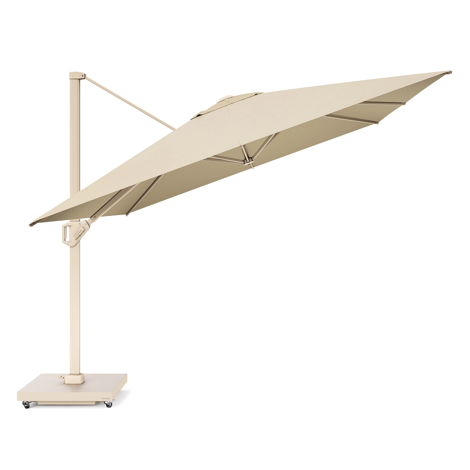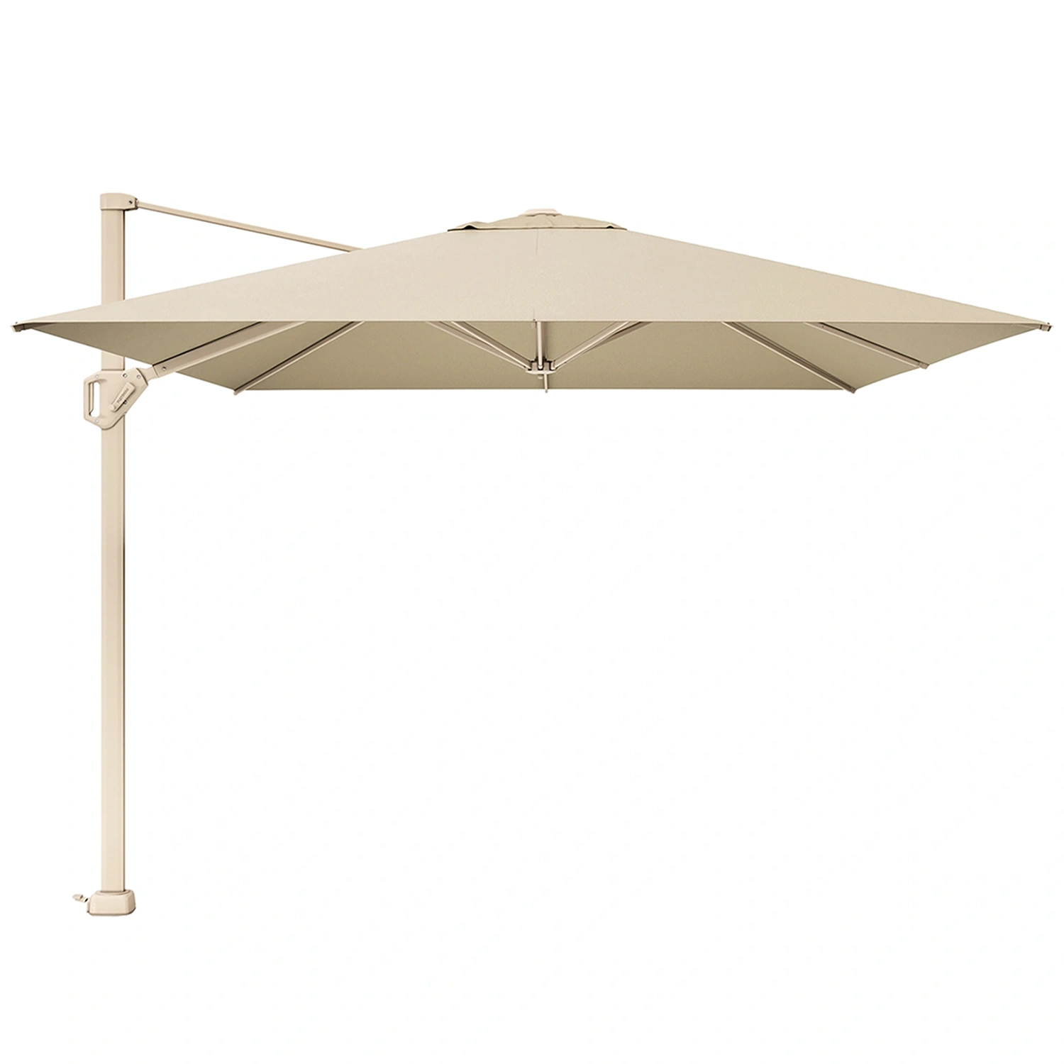 Challenger T¹ frihängande parasoll med stativ i sandfärgad aluminium och Premiumduk i färgen Champagne. Samtida. Stabil. Lätt att använda. Mycket skugga tack vare bakåtlutning, 360° roterande bas.