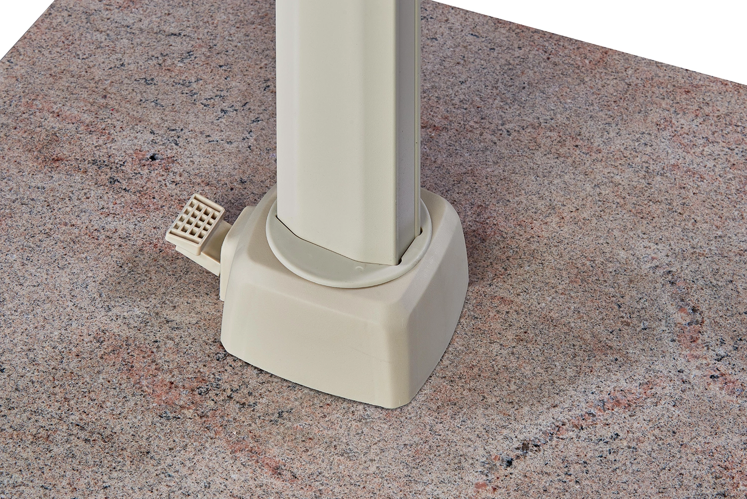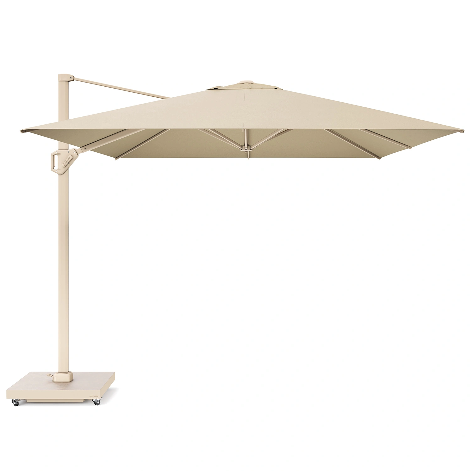 Parasollet levereras utan bas eller fotkryss. Parasollet kräver en parasollfotsvikt minst 120 kg. Vi rekommenderar att du placerar detta parasoll på en parasollfot från Platinum Sun & Shade. Dessa är försedda med hjul så att parasollet är lätt att flytta. Platinum Sun & Shade erbjuder även In-Ground parasollfötter som kan grävas ner eller gjutas fast i marken. Detta ger dig mer utrymme på din uteplats.