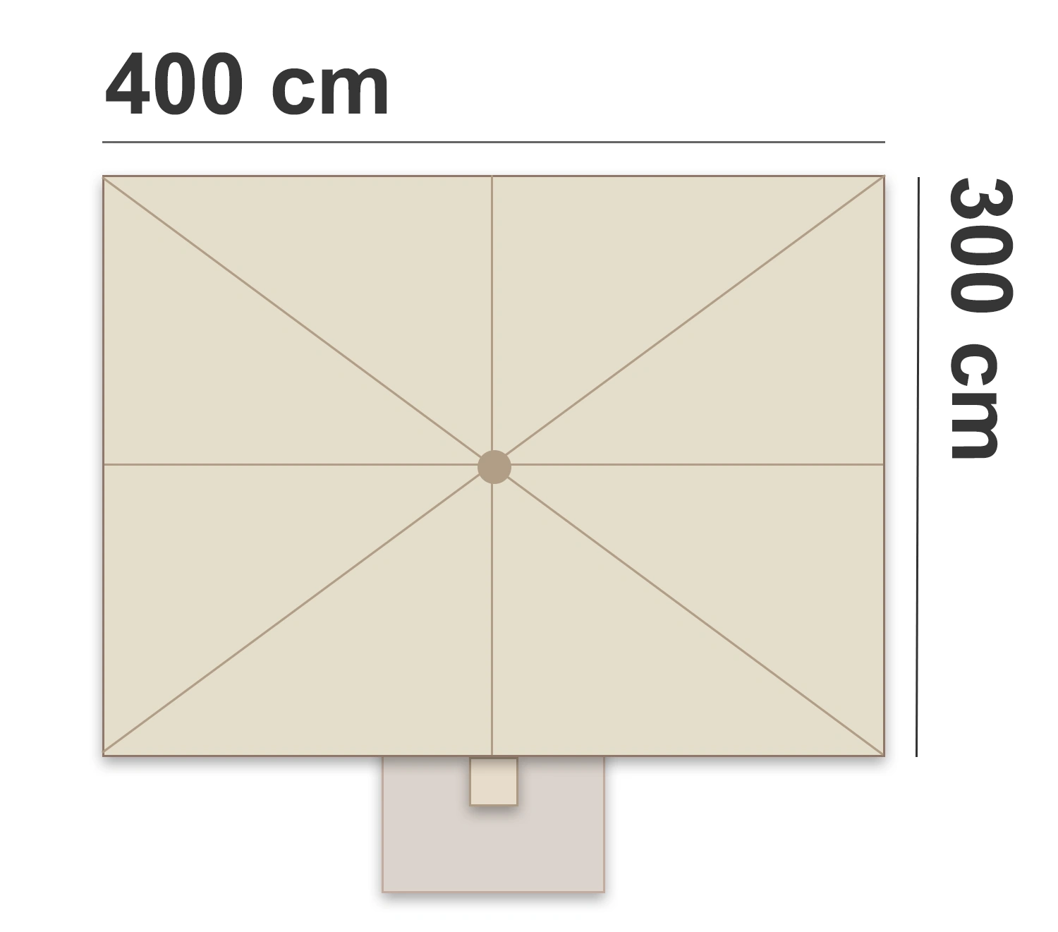 Detta parasoll har en rektangulär parasollduk. Kapellet är 400 cm brett och 300 cm djupt.