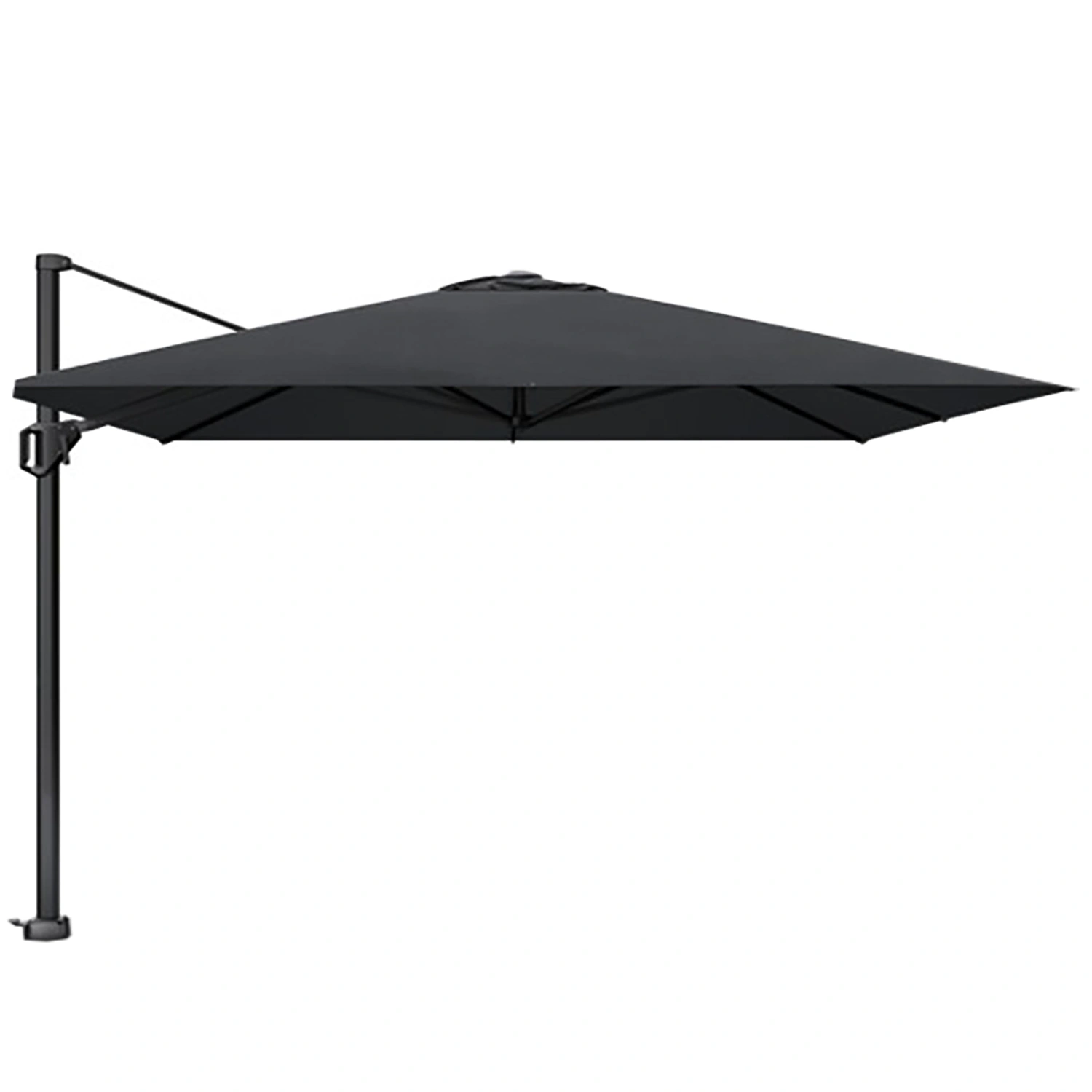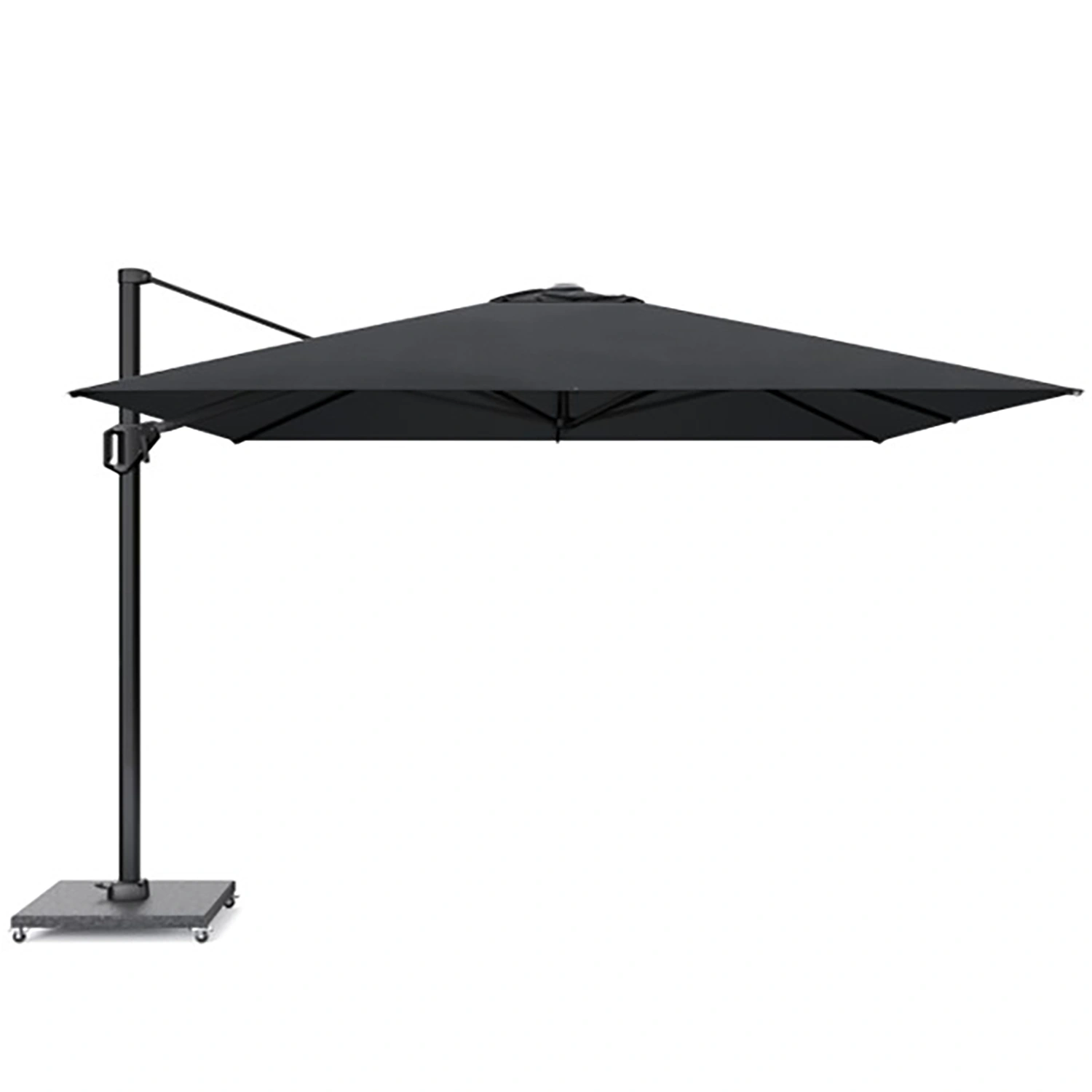 Challenger T¹ frihängande parasoll med stativ i matt svart aluminium och Premiumduk i färgen Jet Black. Samtida. Stabil. Lätt att använda. Mycket skugga tack vare bakåtlutning, 360° roterande bas.