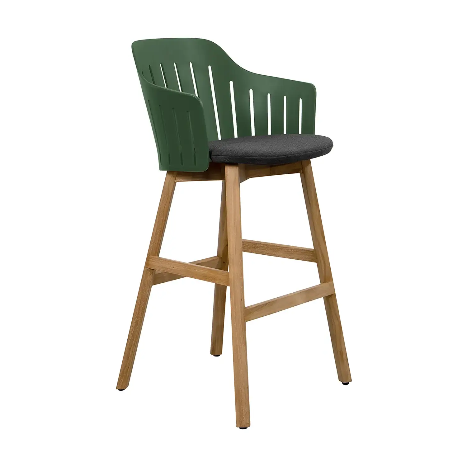 Choice barstol med underrede i teak. Barstolen finns i två höjder, en höjd som matchar bra med barbord och en som matchar bra med bänkar, exempelvis köksbänkar och bardiskar.
