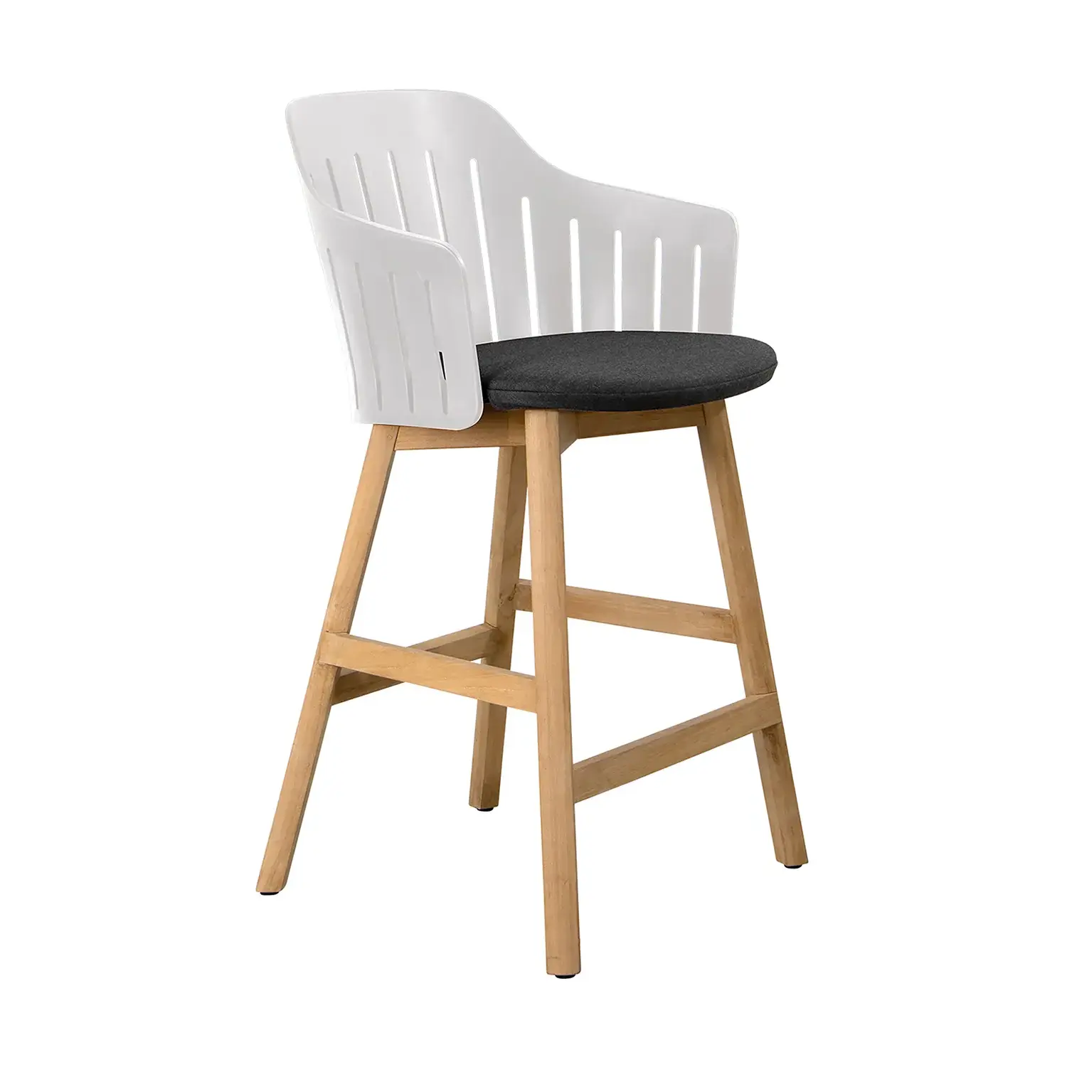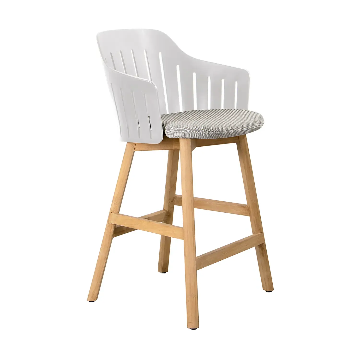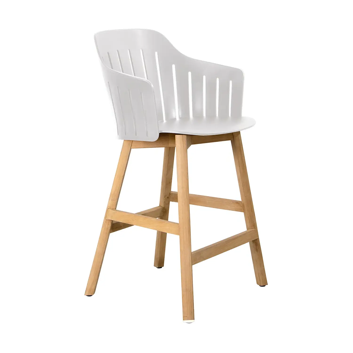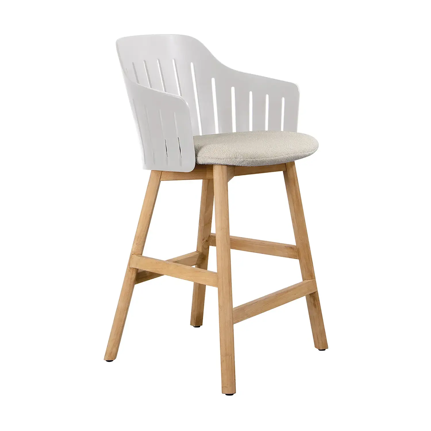 Choice barstol med underrede i teak. Barstolen finns i två höjder, en höjd som matchar bra med barbord och en som matchar bra med bänkar, exempelvis köksbänkar och bardiskar.