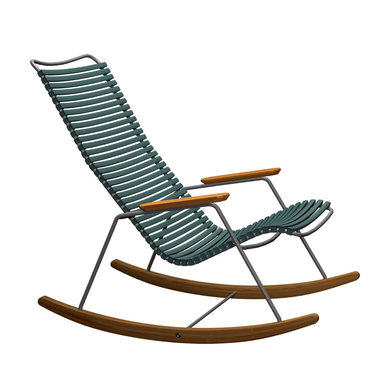Click gungstol är tillverkat av ett pulverlackerat stålstativ med enkla, ergonomiskt väl genomtänkta plastlameller. Lamellerna går lätt att plocka av och ersätta med nya i andra färger, på så sätt kan du skapa dig en helt unik stol. Här visas stolen med lameller i färgen tallgrön. Lamellerna är utformade så att de sviktar precis lagom, därför behövs ingen dyna. Stolen har armstöd och medar av bambu.