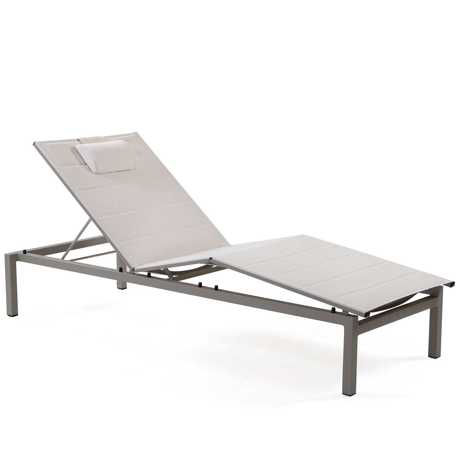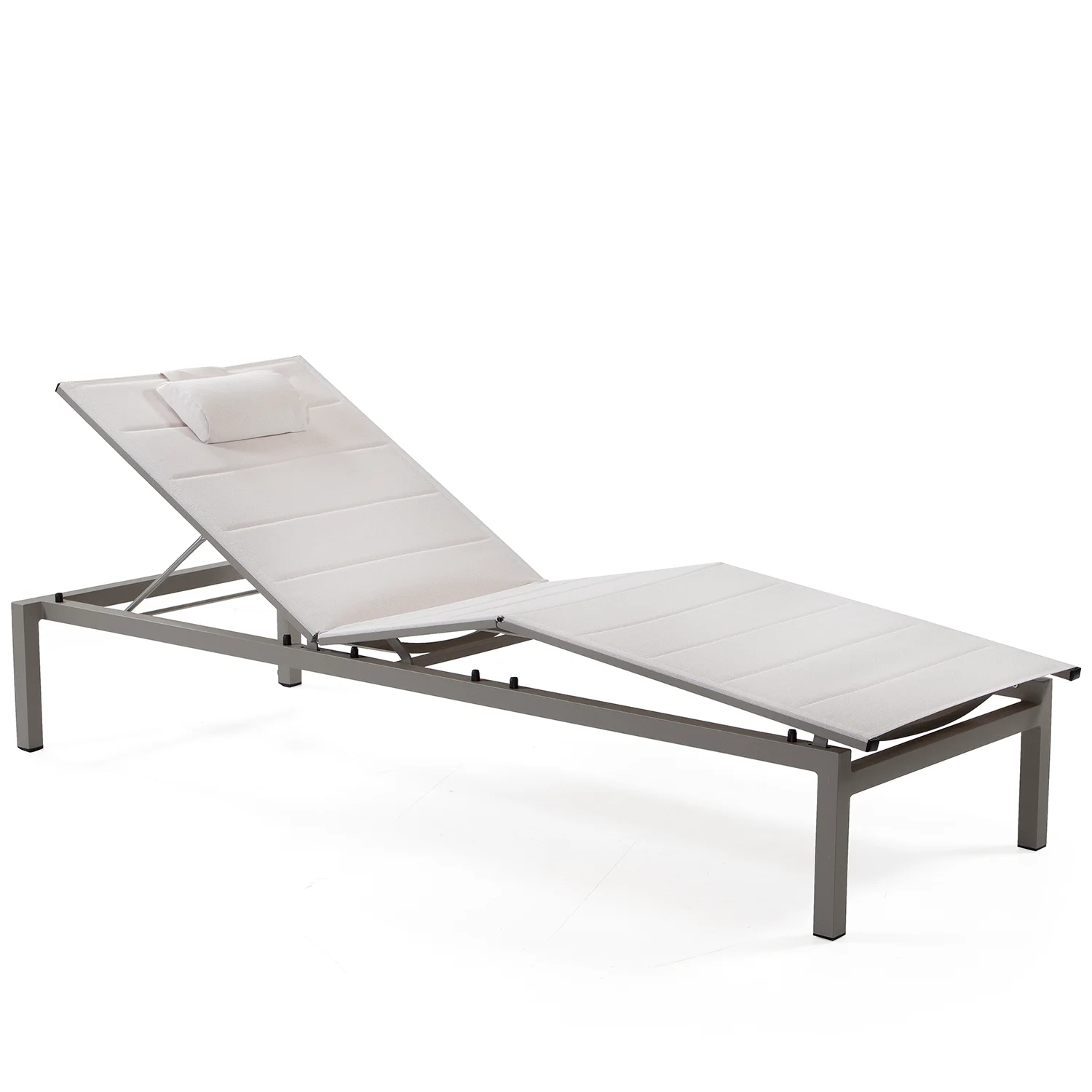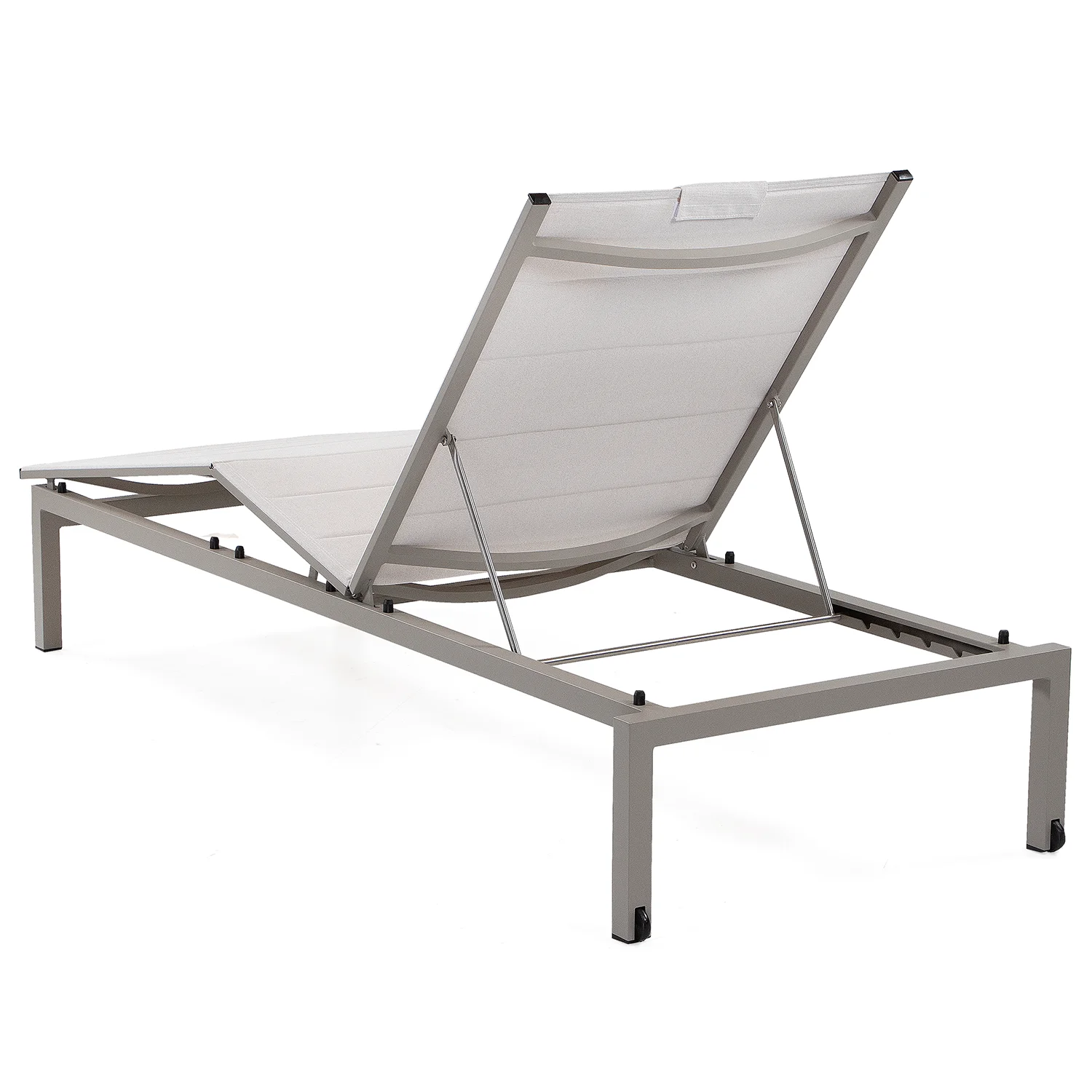 Dallas är en serie med nätta aluminiummöbler med sitsar stoppade med QuickDry-skum. Här visas solsängen i beige sits och stativ i färgen khaki. Solsängens bakre ben är försedda med hjul för enkel förflyttning.