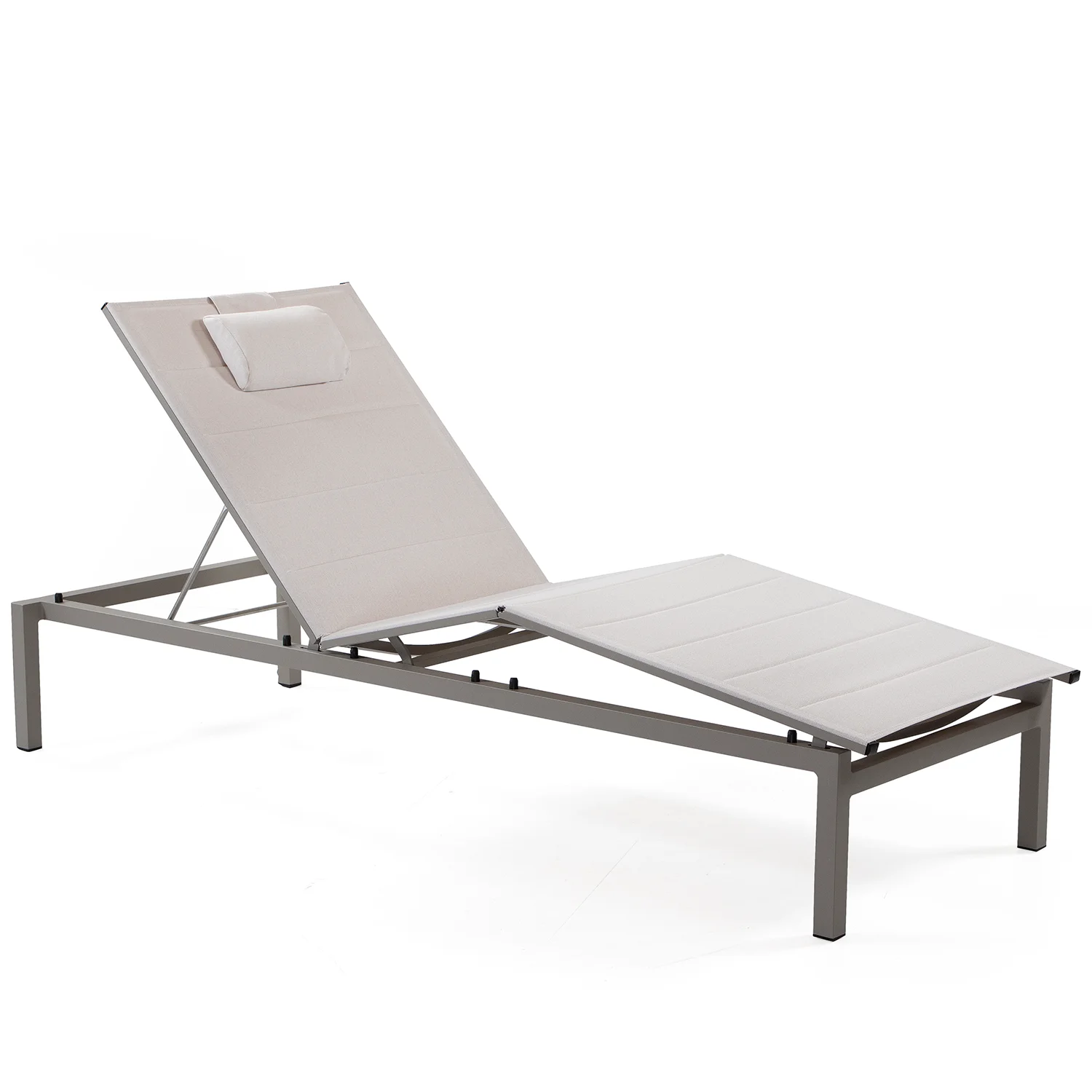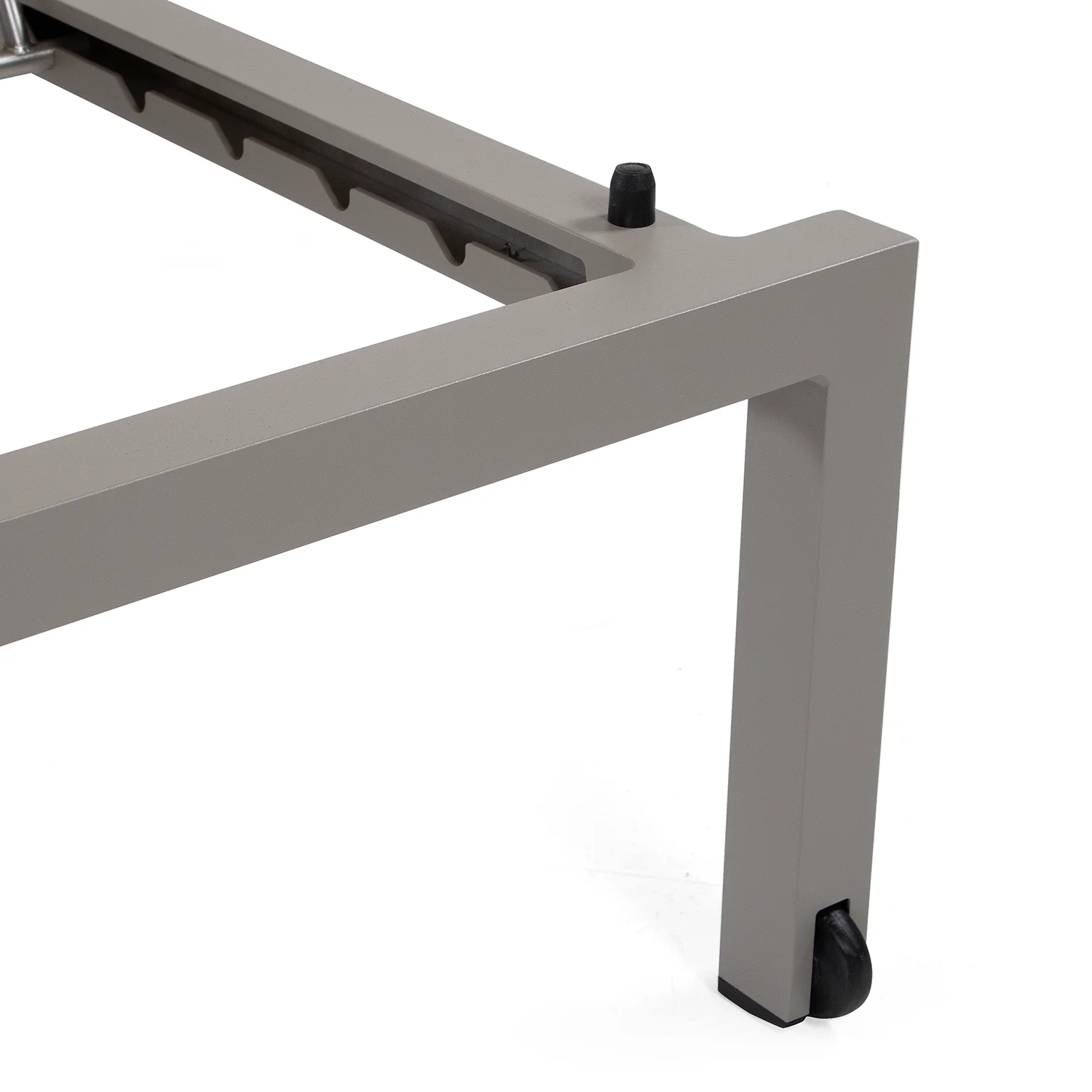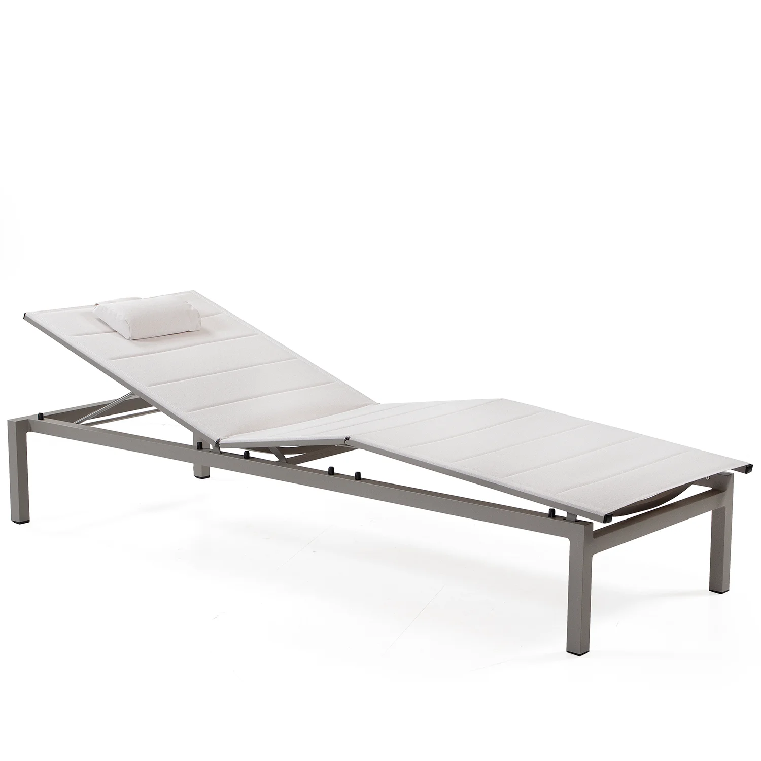 Dallas är en serie med nätta aluminiummöbler med sitsar stoppade med QuickDry-skum. Här visas solsängen i beige sits och stativ i färgen khaki. Solsängens bakre ben är försedda med hjul för enkel förflyttning.