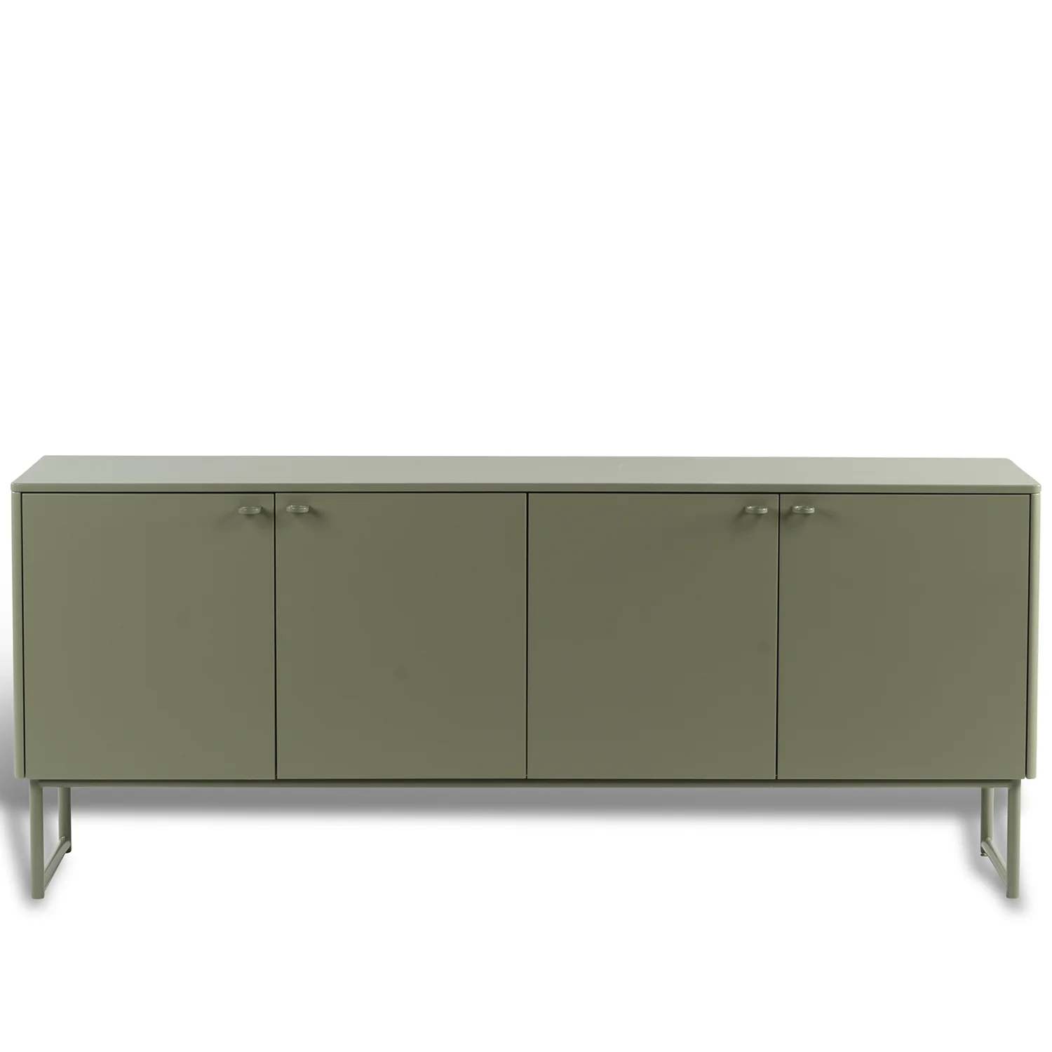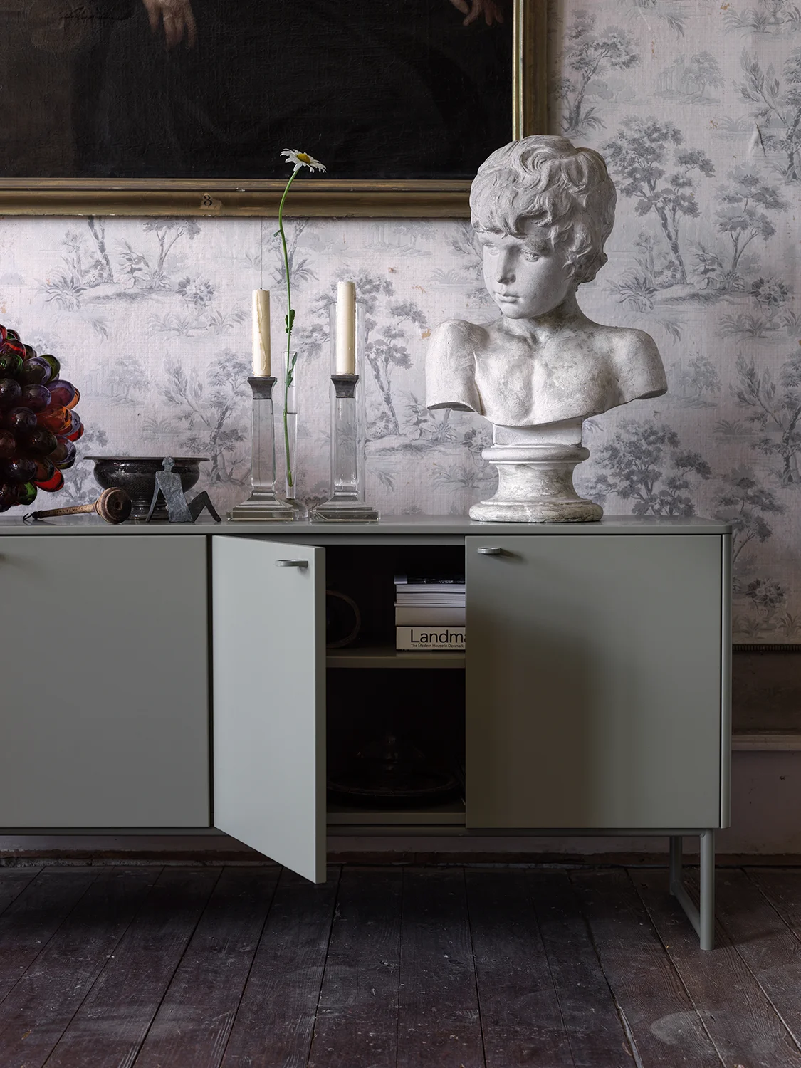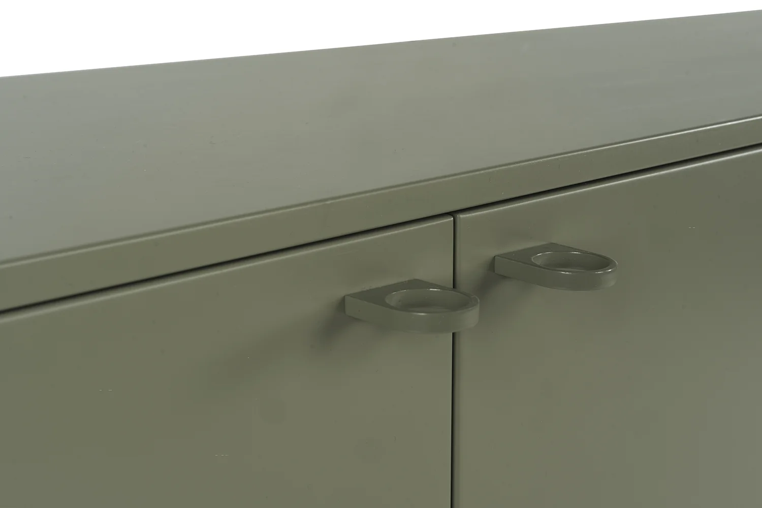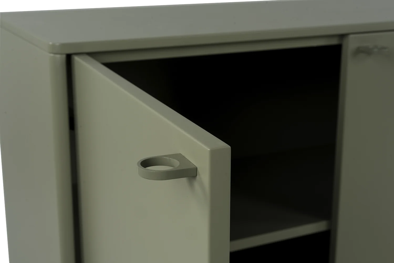 Deus är en vacker, nätt skänk med skåp i olivgrå lackad MDF. En lite grundare möbel som har plats för mycket men som inte tar plats.