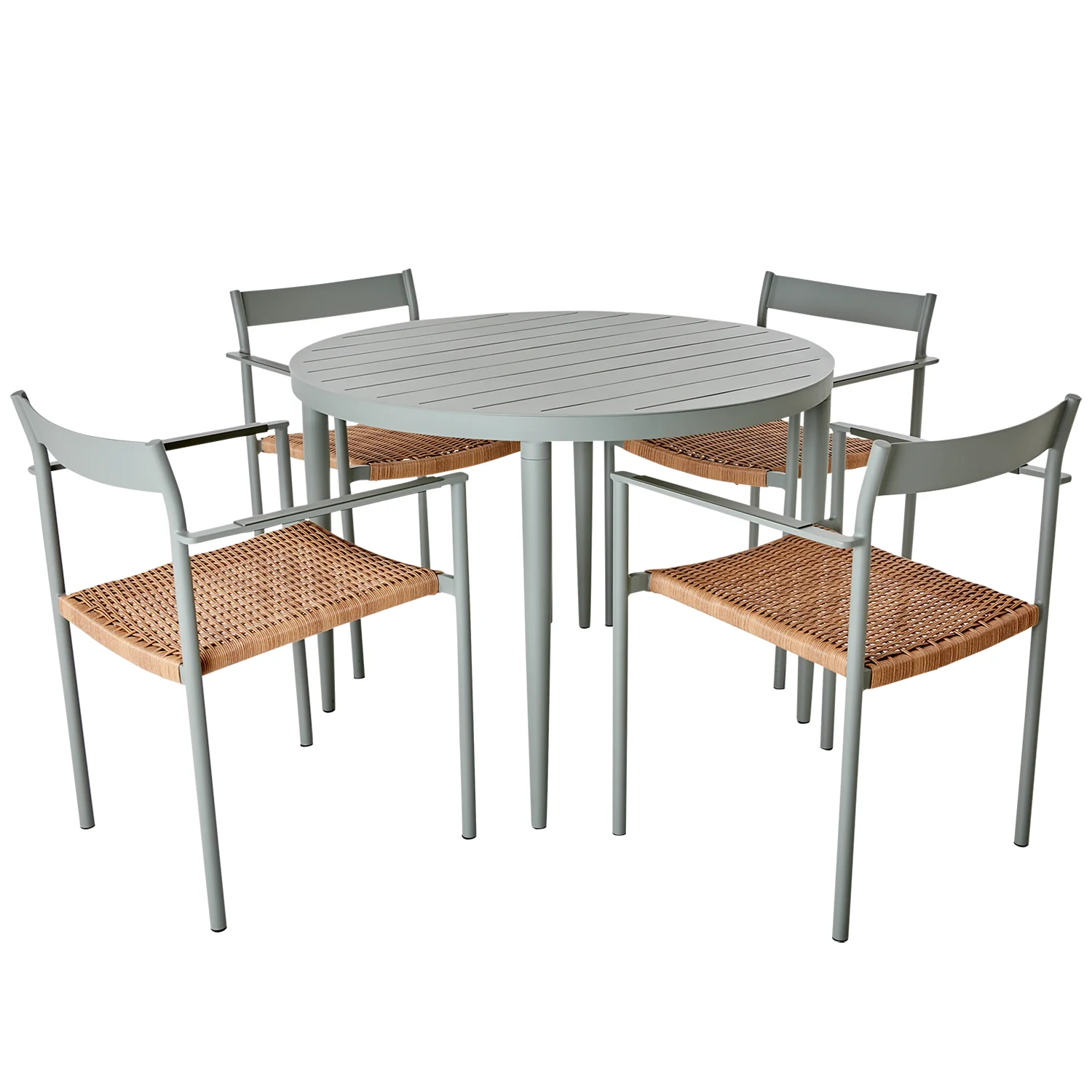 Matgrupp med runda matbordet Bigby och stapelstolen DK. Standardgruppen består av 4 stycken stolar och 1 bord, men det går även att lägga till fler stolar.