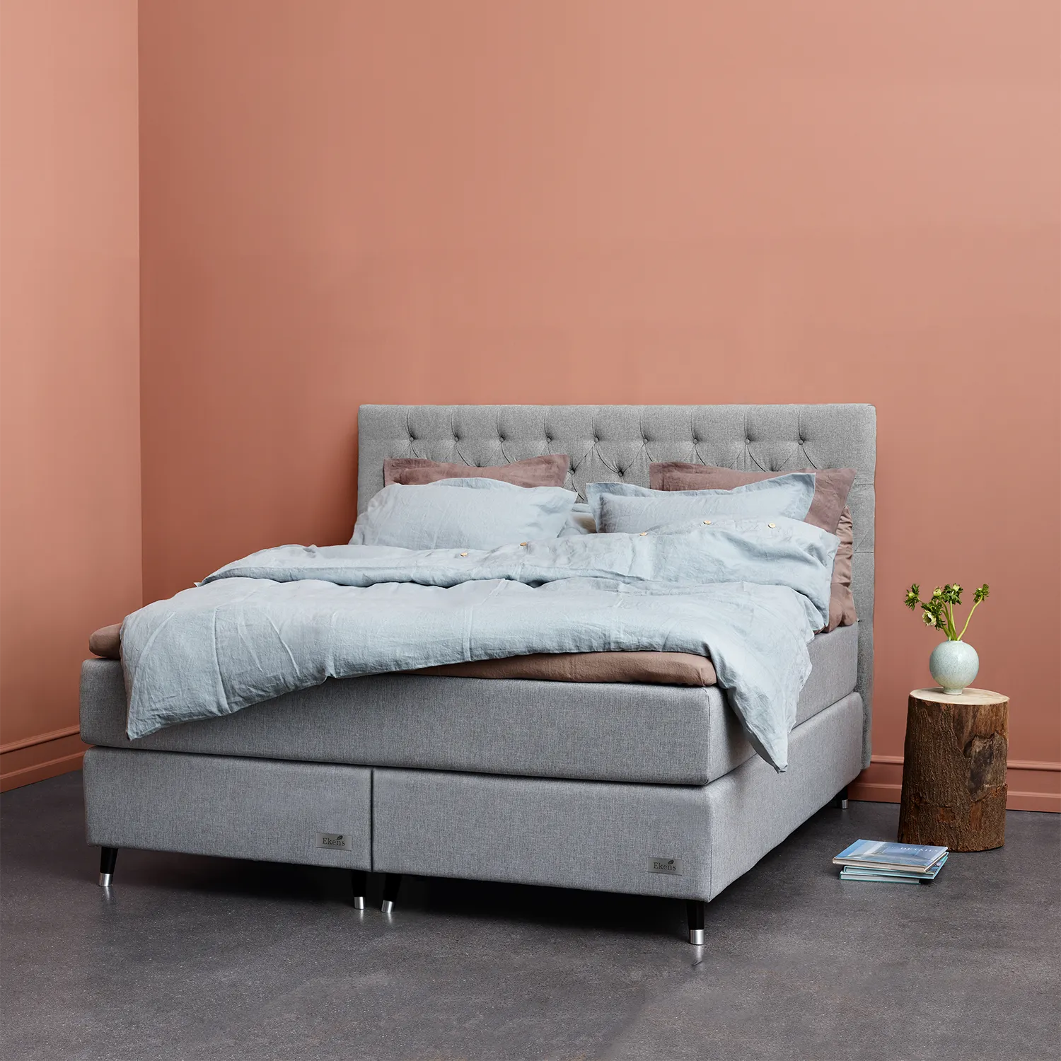 Elegans Limited Edition säng i färgen ljusgrå. Ett tillfälligt erbjudande på Ekens toppmodell Elegans i färgen ljusgrå. Sängen kommer i storleken 180×200 cm. Det finns möjlighet att köpa till en knappad huvudgavel i samma färg som sängen för endast 6 995 kr.