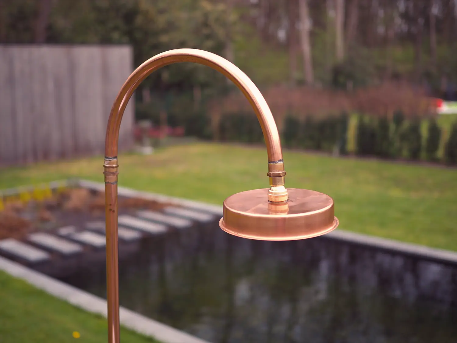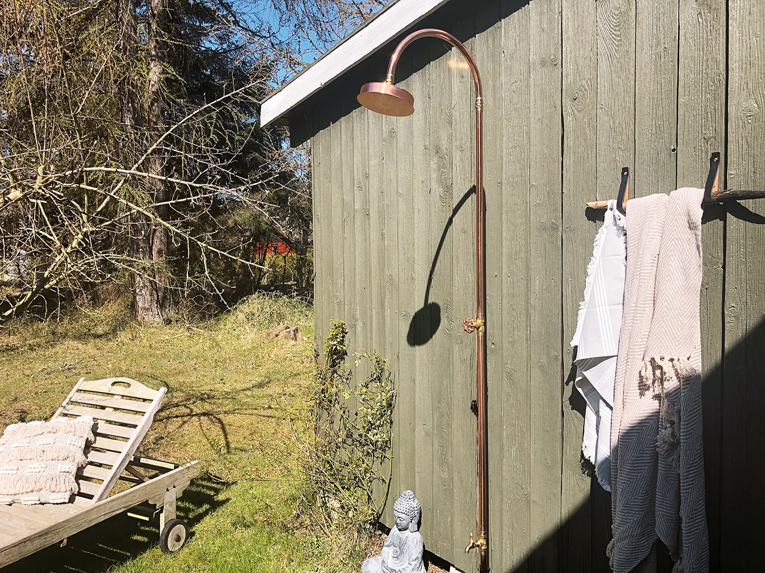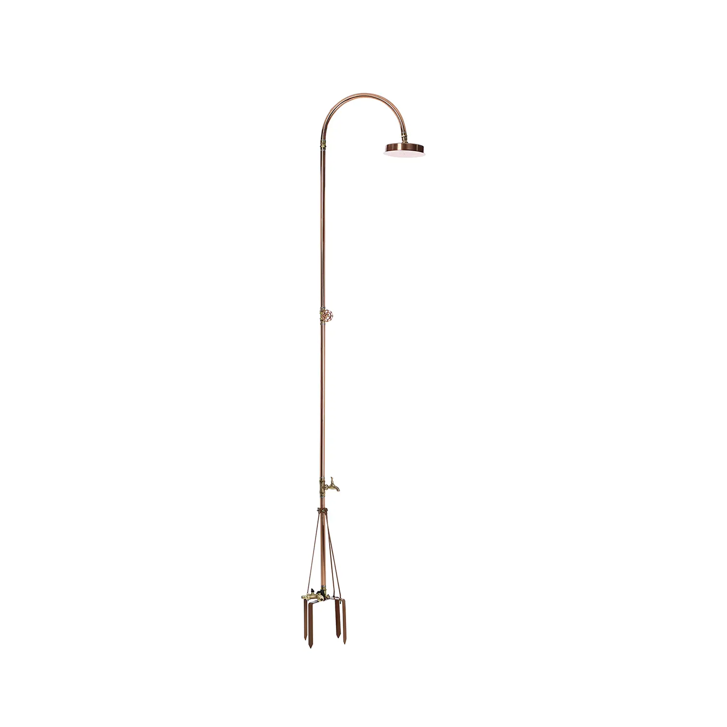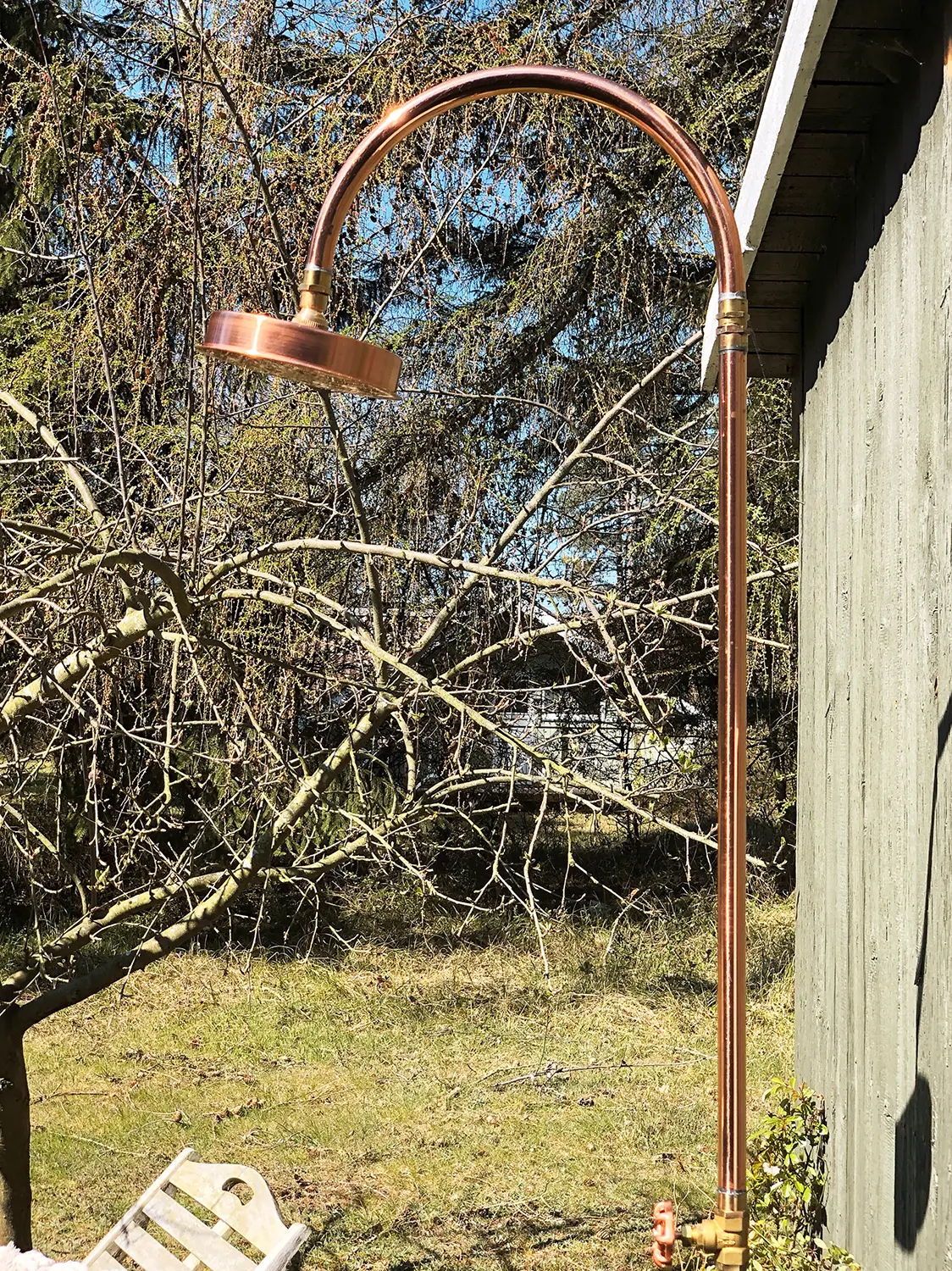 Denna lyxiga och eleganta trädgårdsdusch i koppar från danska Excel är en fristående utomhusdusch som enkelt placeras i gräsmattan med foten. Inga större installationer eller svåra bruksanvisningar behövs.