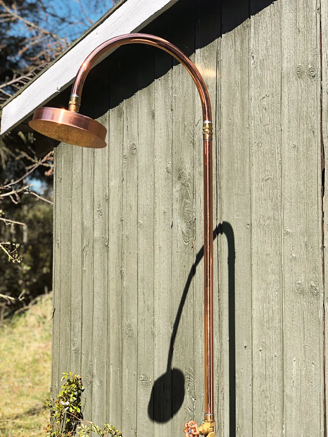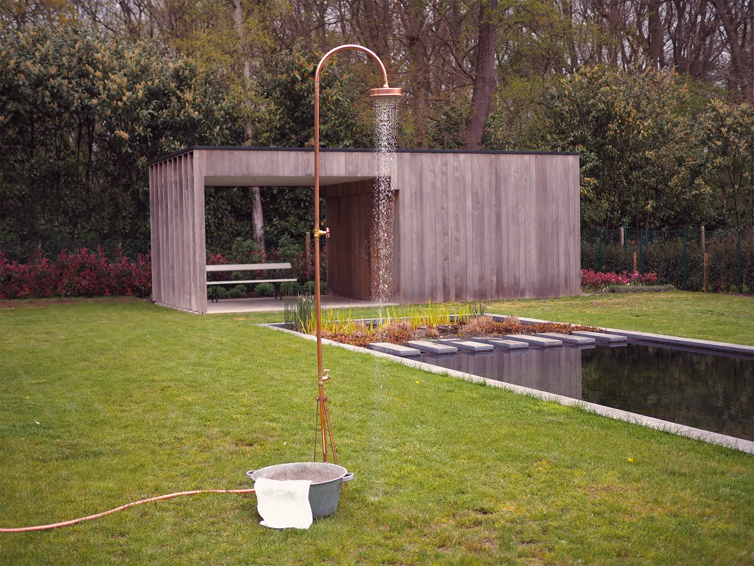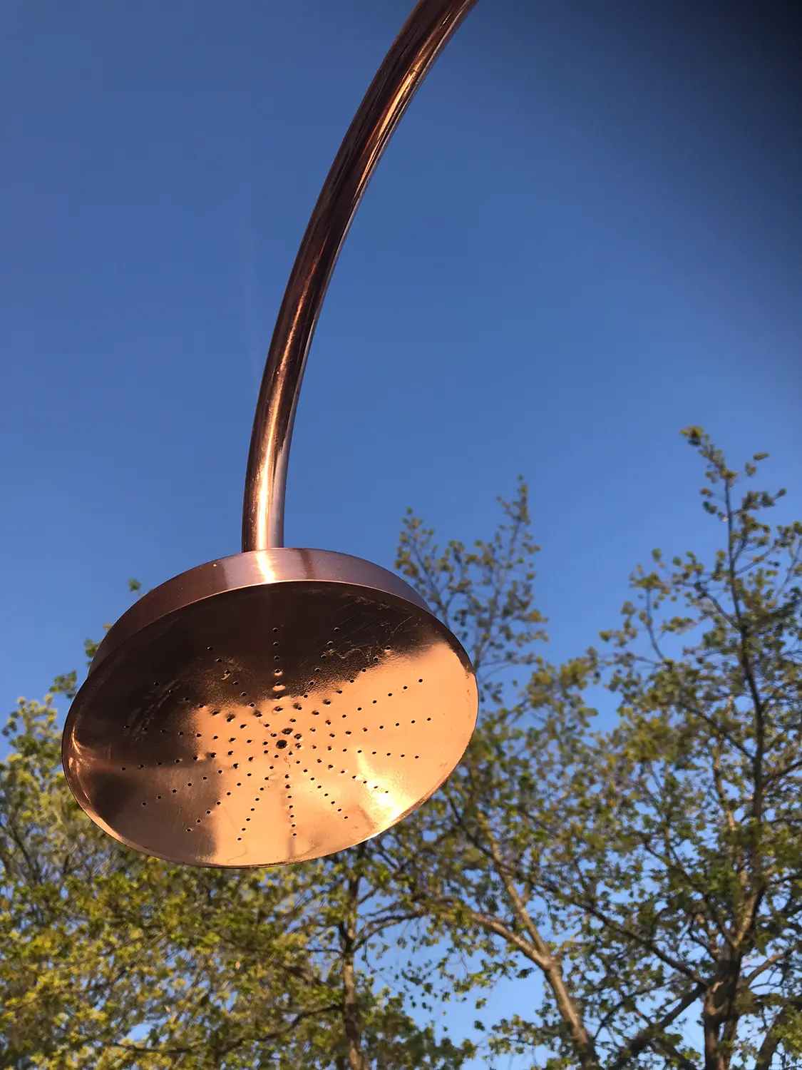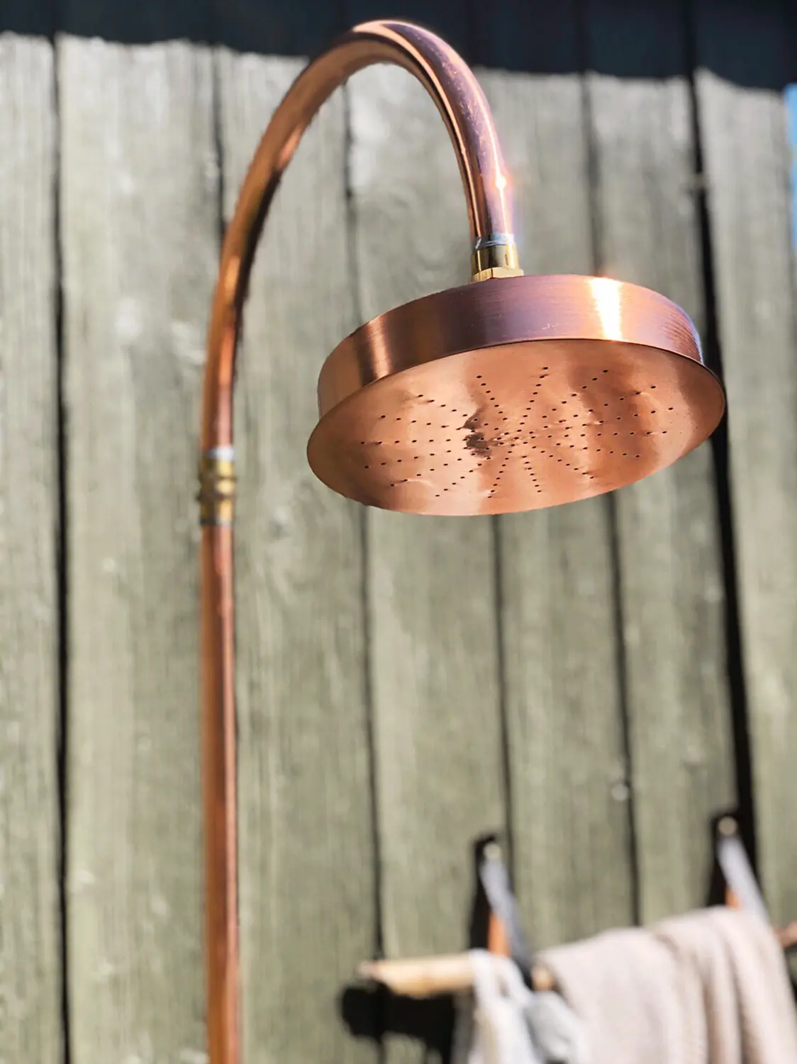 Denna lyxiga och eleganta trädgårdsdusch i koppar från danska Excel är en fristående utomhusdusch som enkelt placeras i gräsmattan med foten. Inga större installationer eller svåra bruksanvisningar behövs.