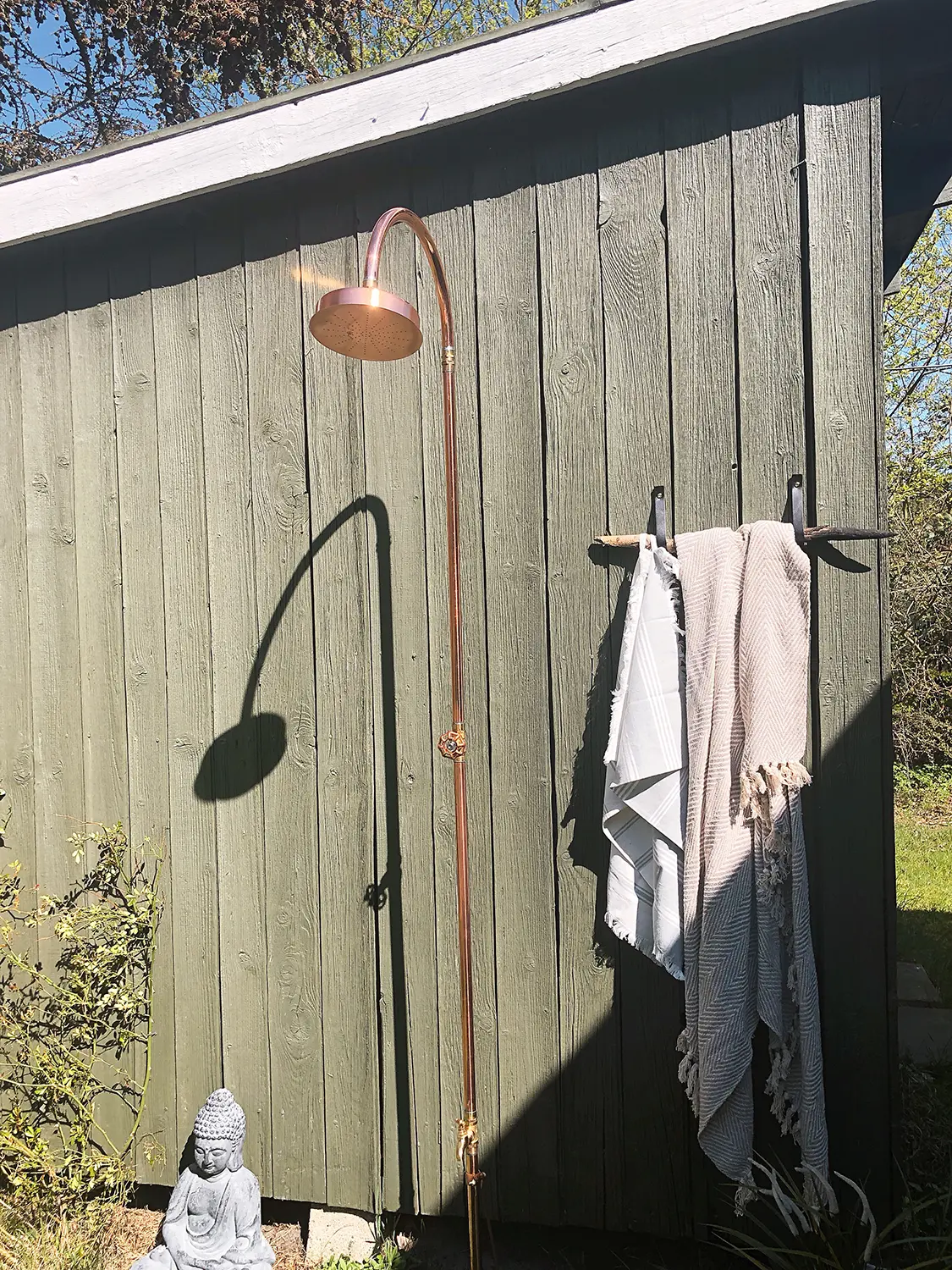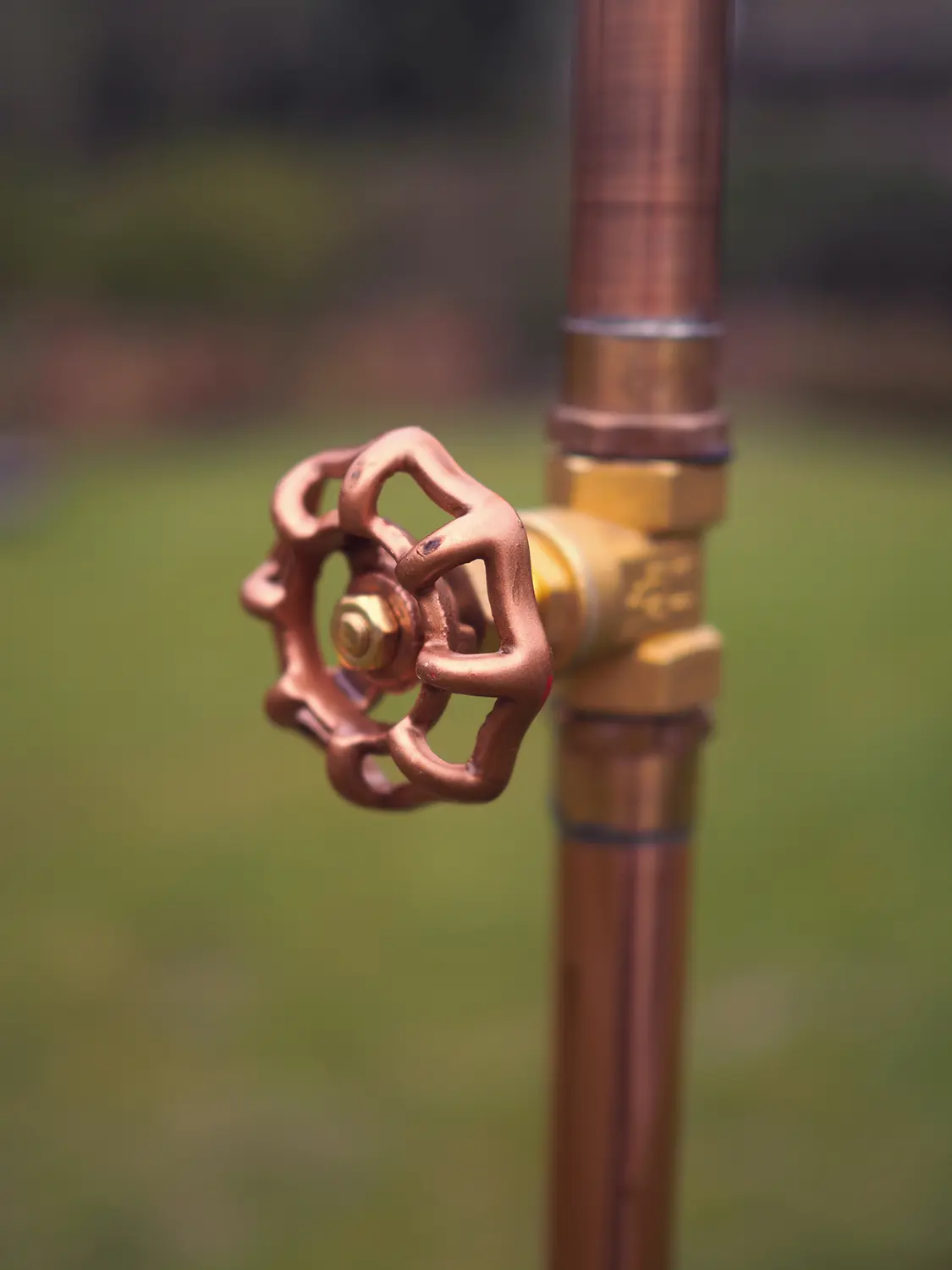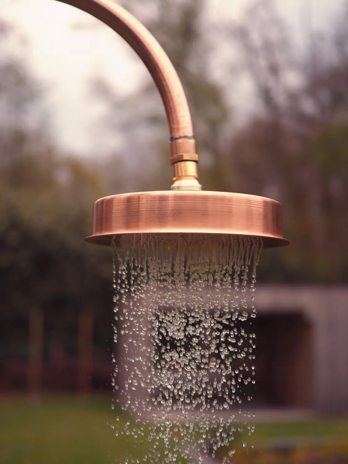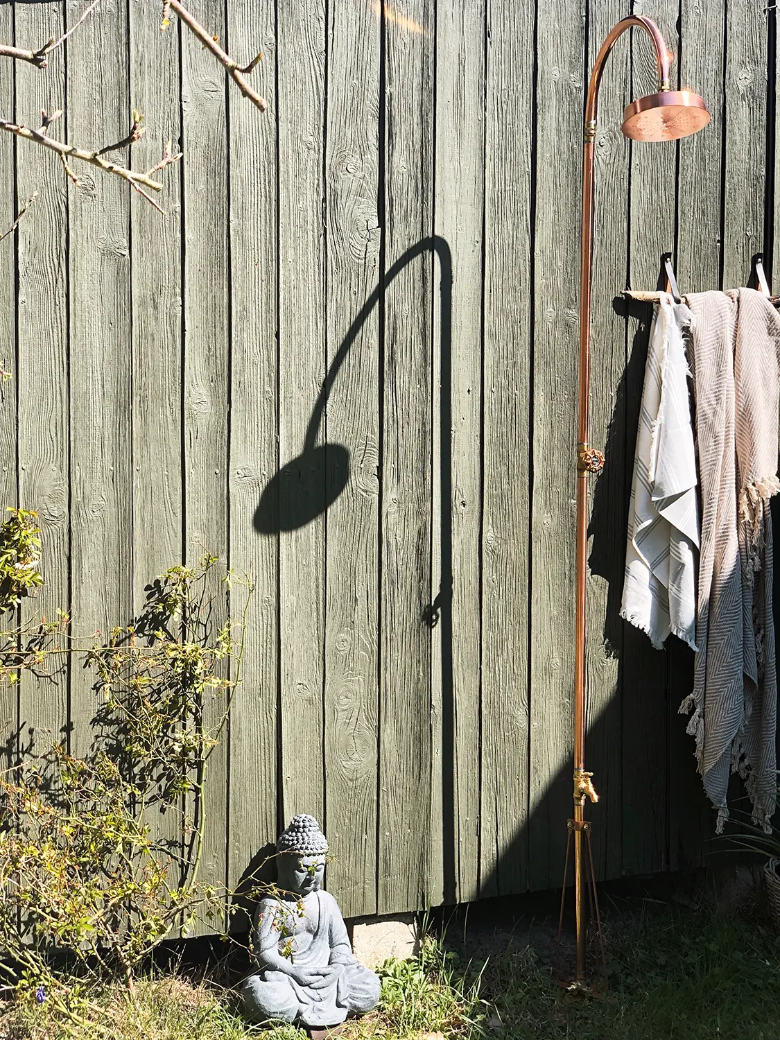 Denna lyxiga och eleganta trädgårdsdusch i koppar från danska Excel är en fristående utomhusdusch som enkelt placeras i gräsmattan med foten. Inga större installationer eller svåra bruksanvisningar behövs.