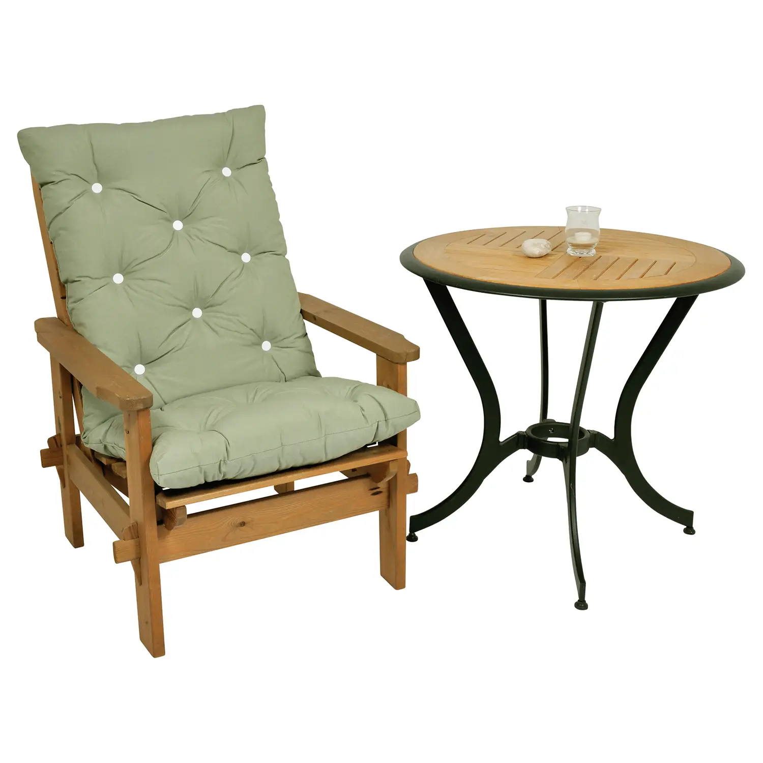 Högvik flockdyna visas här i enfärgat tyg i Dralon. Dralondynor är mycket tåliga mot solblekning och kommer att hålla färgen i många år. Dynan har vita knappar i plast i rygg och sits.