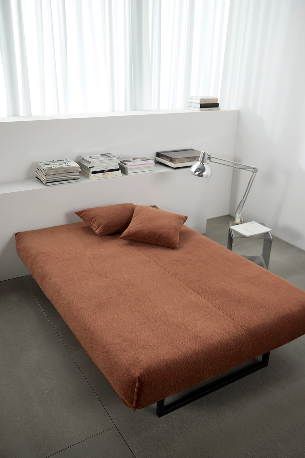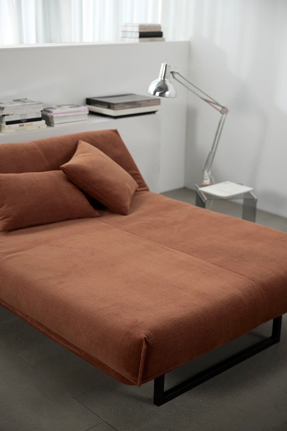 Fraction är en högkvalitativ bäddsoffa, perfekt för ett 1-rumsboende eller små bostäder. Dess fyra-stegs huvudhöjning som säng och två lutande rygglägen som soffa säkerställer bekvämt boende dag och natt. Soffans ram är tillverkad i stål med ribbor i björkträ som kan täckas med ett överdrag i tyg. Madrassen är tillverkad i Danmark. Soffan går att fälla så att den blir en bekväm liggplats med nackstöd.