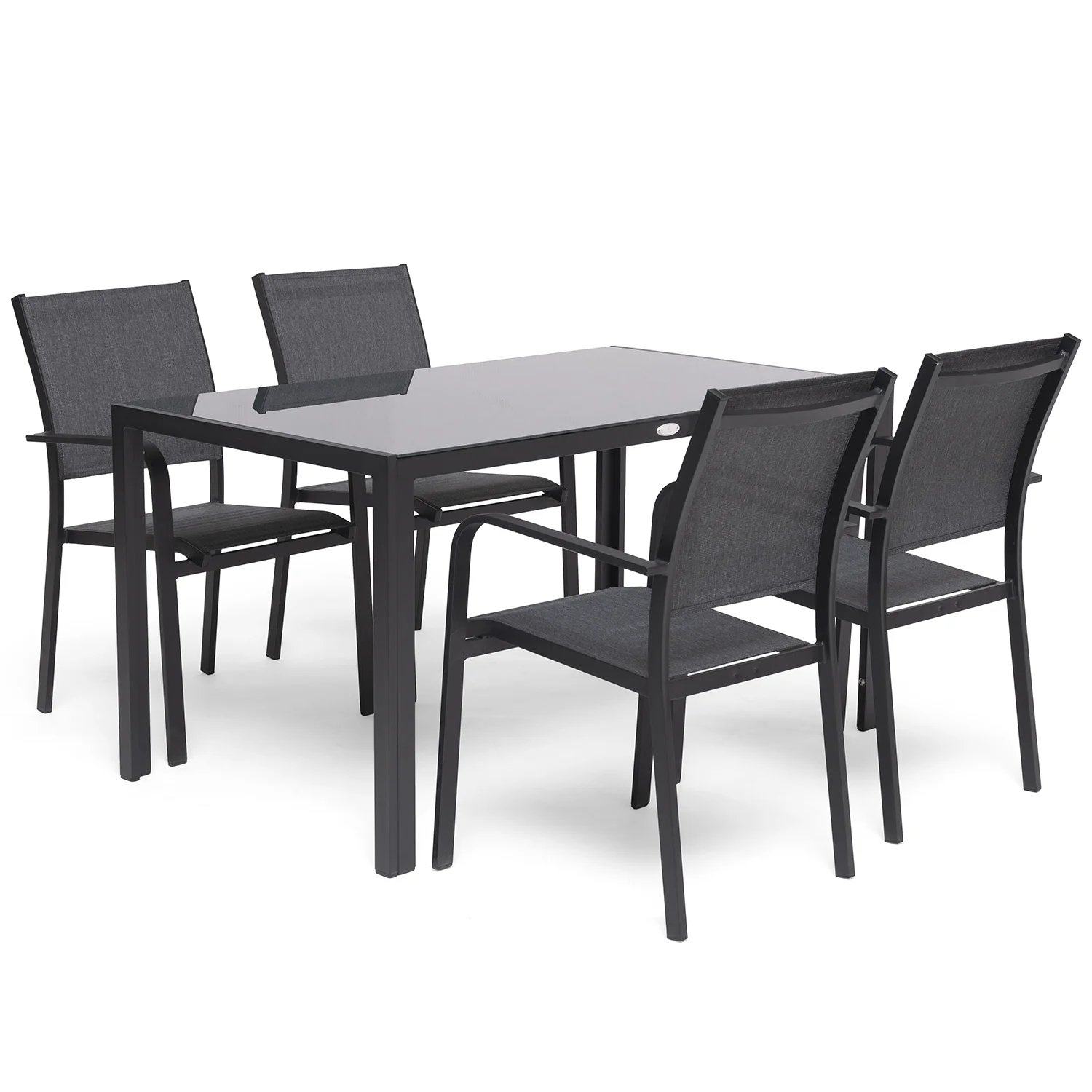 Hånger matgrupp med 140 cm långt bord och stapelstolar. Hånger stapelstol är en stilren och lättskött stol med låg rygg i aluminium och textilen.