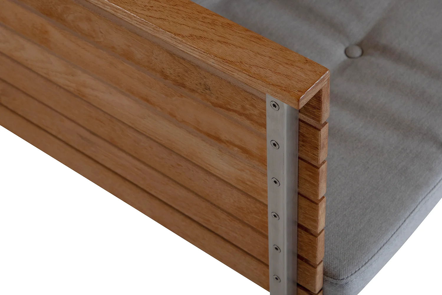 Häringe fåtölj i teak, med ram i borstat rostfritt stål. Utomhusdynorna har knappar och dekorativa sömmar. Dyna i färgen ljusgrå.