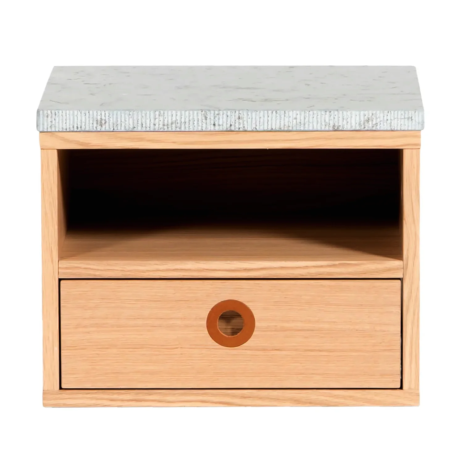 Låda i plywood med underliggande mjukstängande skena. Handtag av läder. Skiva i Svensk logerhuggen kalksten som tillval.