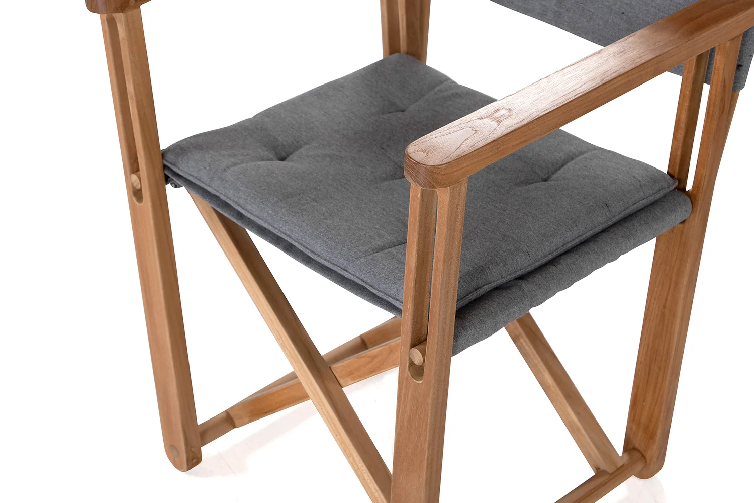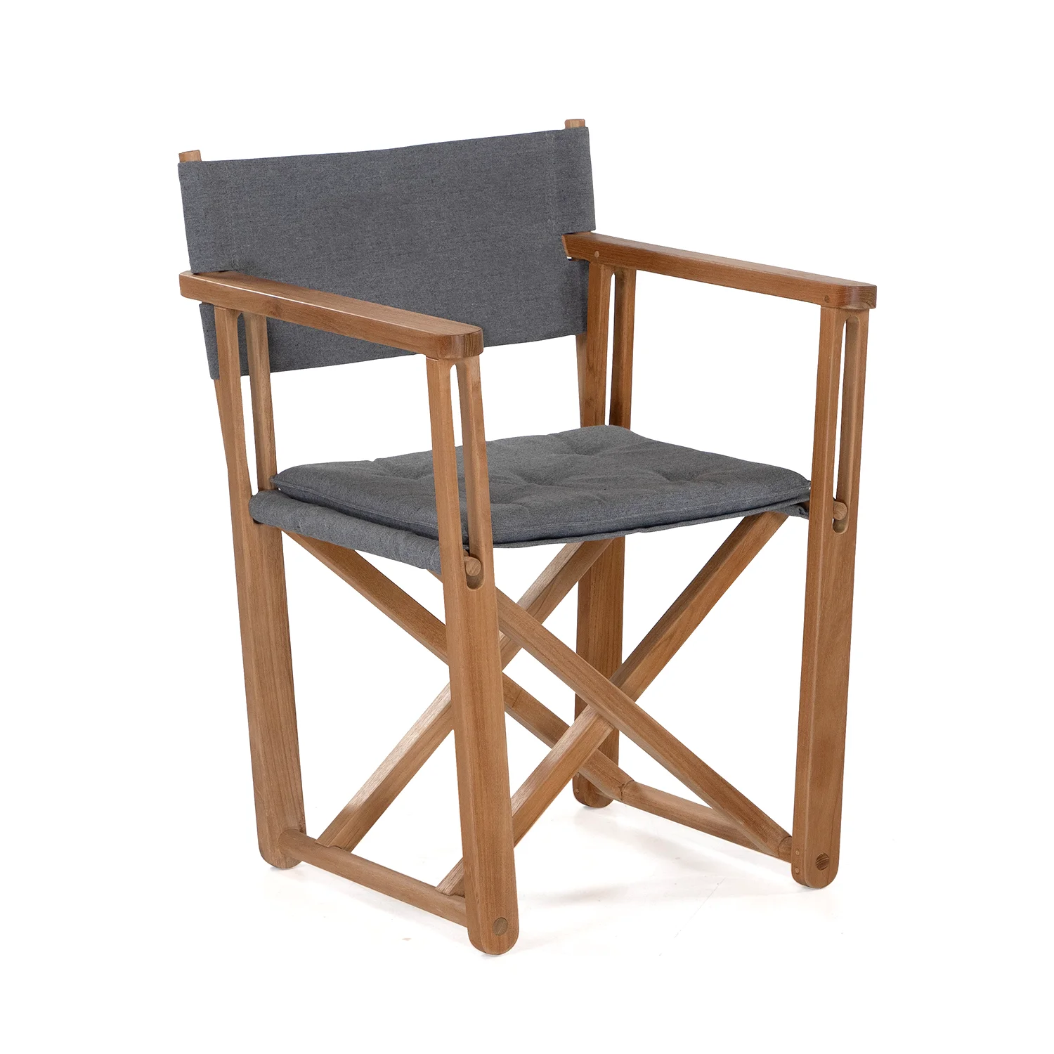 Kryss loungestol i teak och ett grått sunbrellatyg (Heritage Slate) som fästs i ryggen med läderremmar.