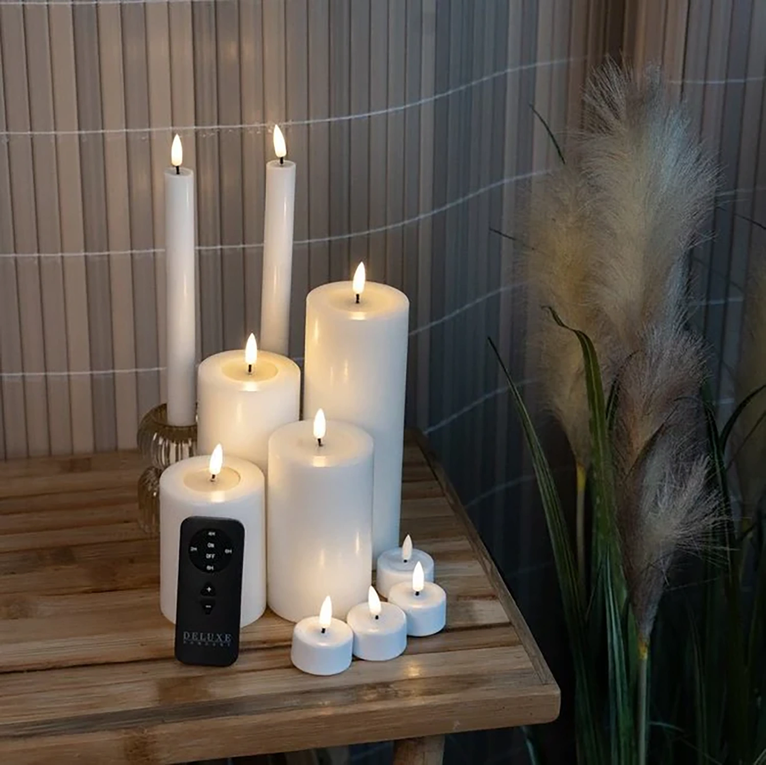 Upplev den förtrollande verklighetstrogna glöden med Deluxe Home Arts innovativa LED-stearinljus som visar upp en 3D Real Flame™ -teknologi. Dessa avancerade konstgjorda stearinljus skapar en autentisk atmosfär med sin rörliga flamma som elegant pulserar och simulerar det naturliga ljuset från äkta stearinljus. Oavsett om det är för mysiga hemmakvällar eller som stämningsskapande element vid speciella tillfällen, erbjuder våra LED-stearinljus med rörlig flamma en säker och vacker belysningslösning.