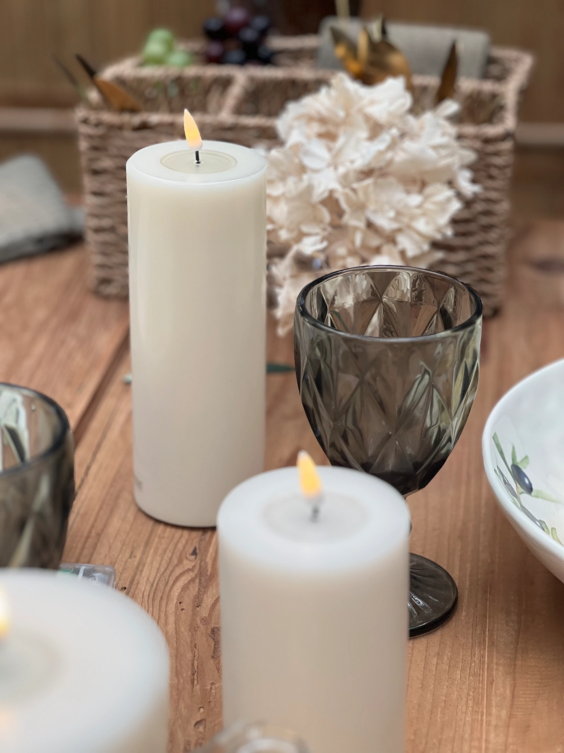 Blockljus för inomhusbruk i vit äkta stearin med mycket verklighetstrogen LED-låga.