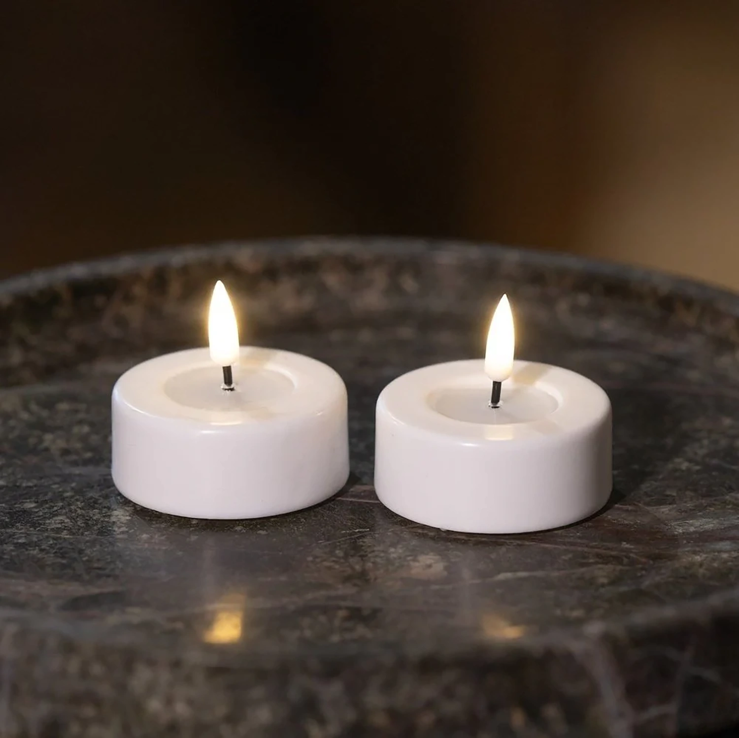 Värmeljus för inomhusbruk i plast och vit äkta stearin med mycket verklighetstrogen LED-låga.
