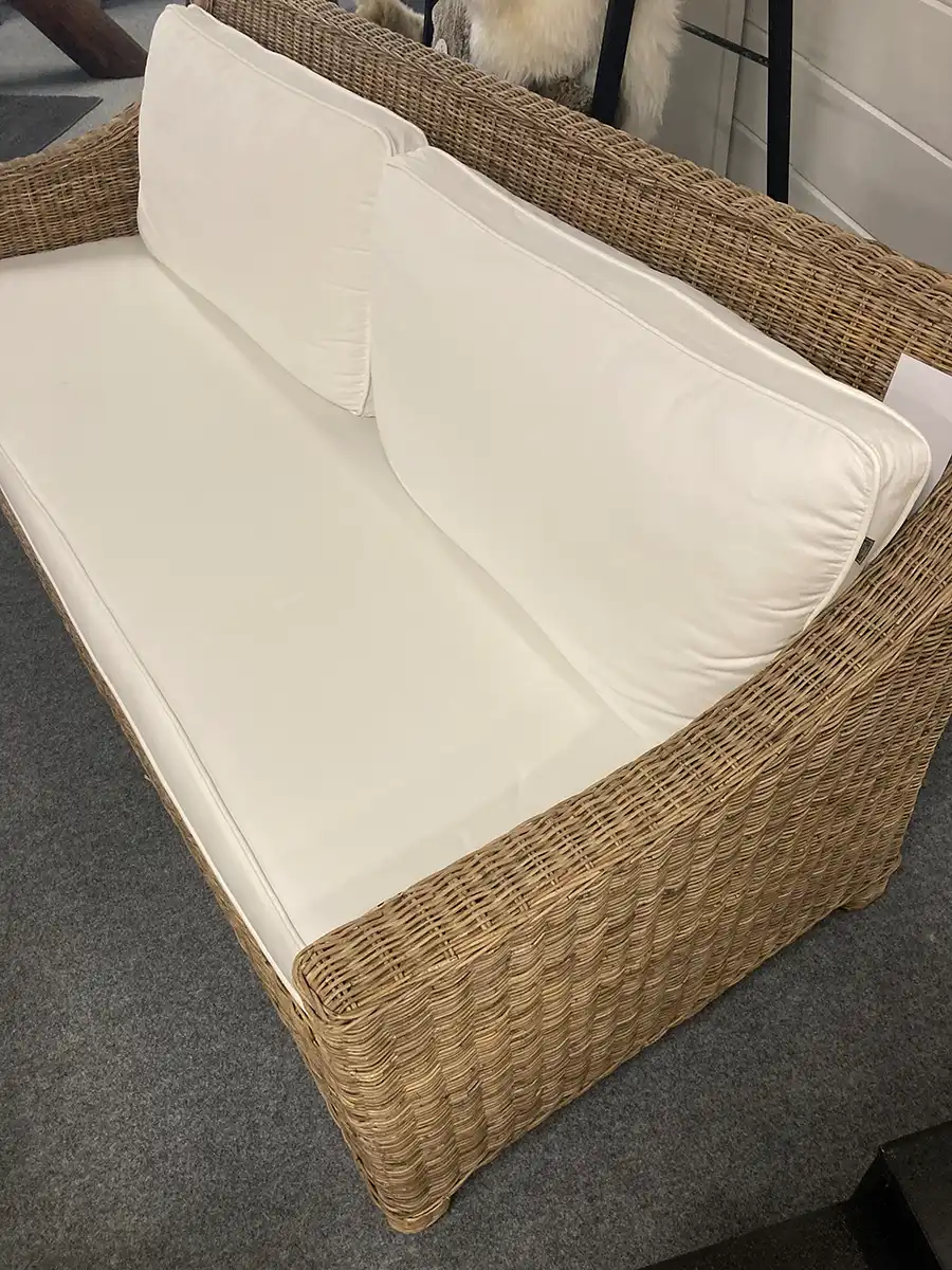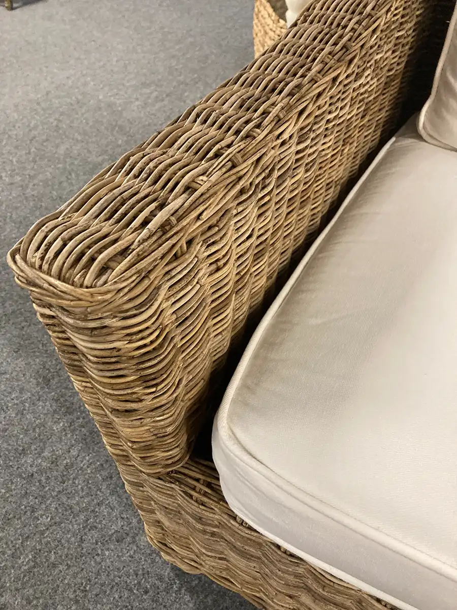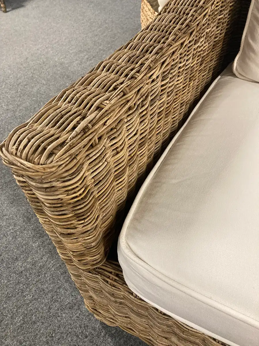 Då rotting är ett naturmaterial är den rekommenderad för användning inomhus. Dynorna består av en polyeterkärna som är svept med fiber alternativt en blandning av riven polyeter och fiber. Vid rengöring behöver du bara torka av rottingen med en lätt fuktad trasa. Klädslarna är avtagbara och vi rekommenderar kemtvätt.