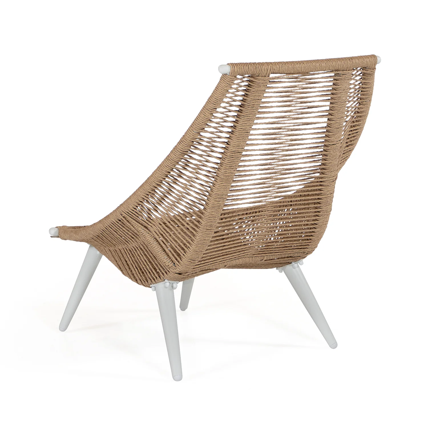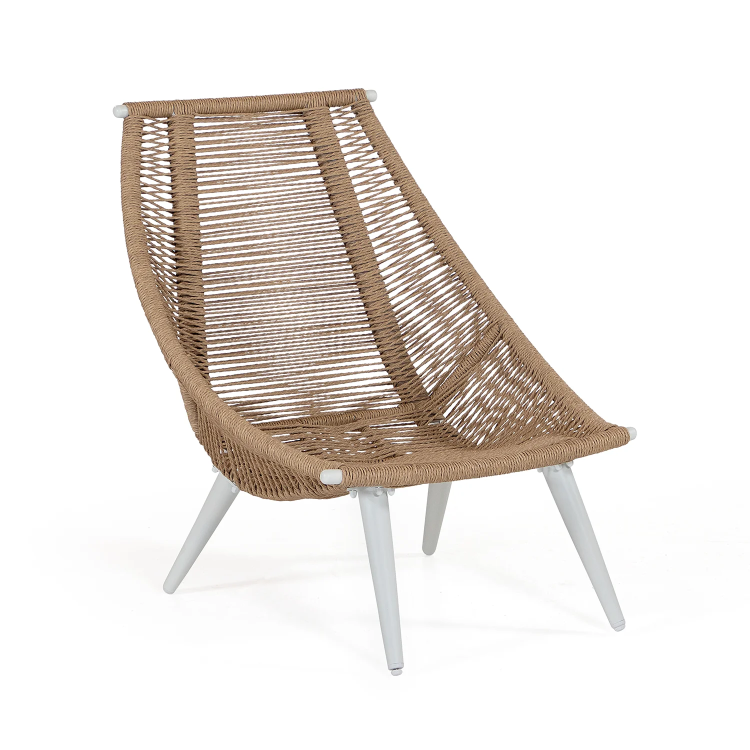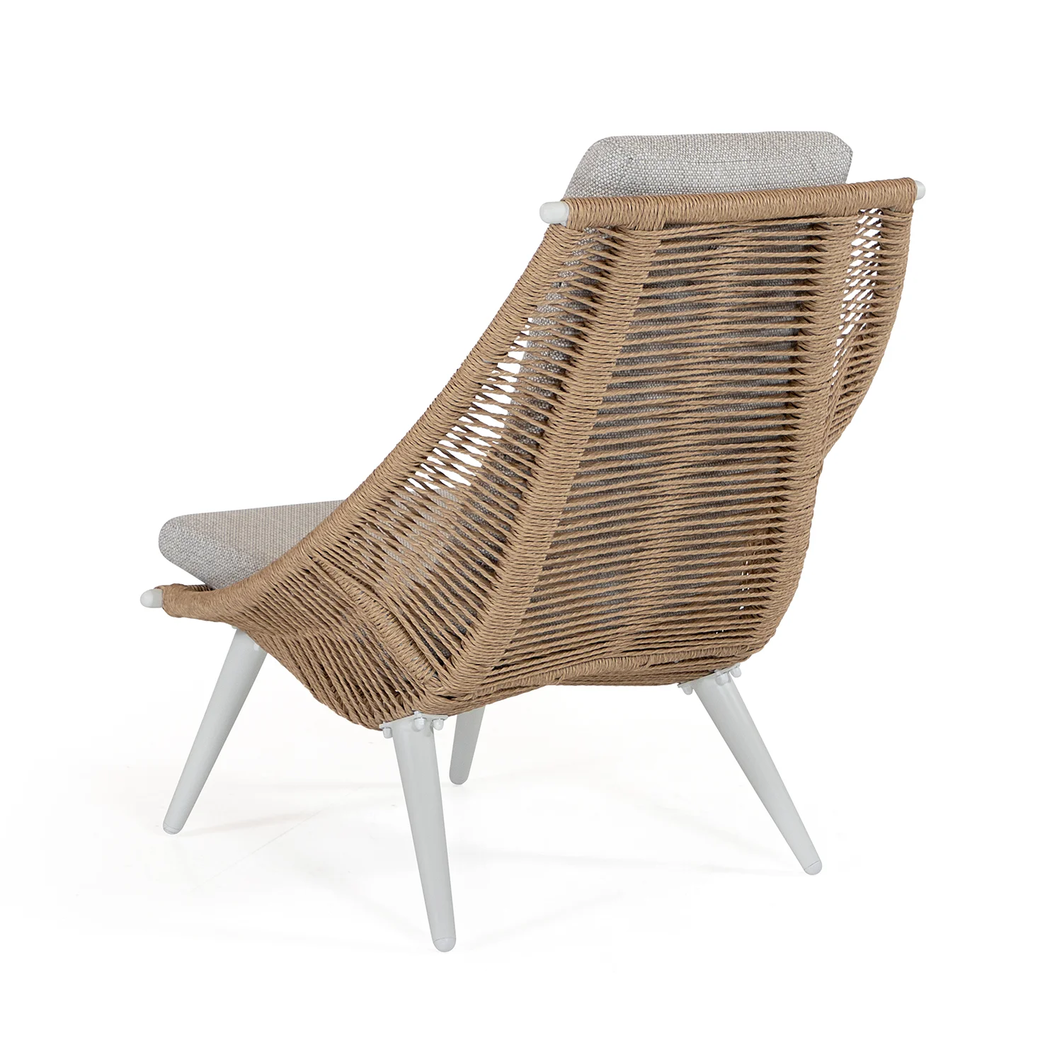 Olivia Relax är en annorlunda kontrottingfåtölj i beige tvinnad konstrotting på en cremefärgad aluminiumstomme. Dynorna är i ljust beige med liner på insidan av tyget, vilket gör att stoppningen håller sig torr.