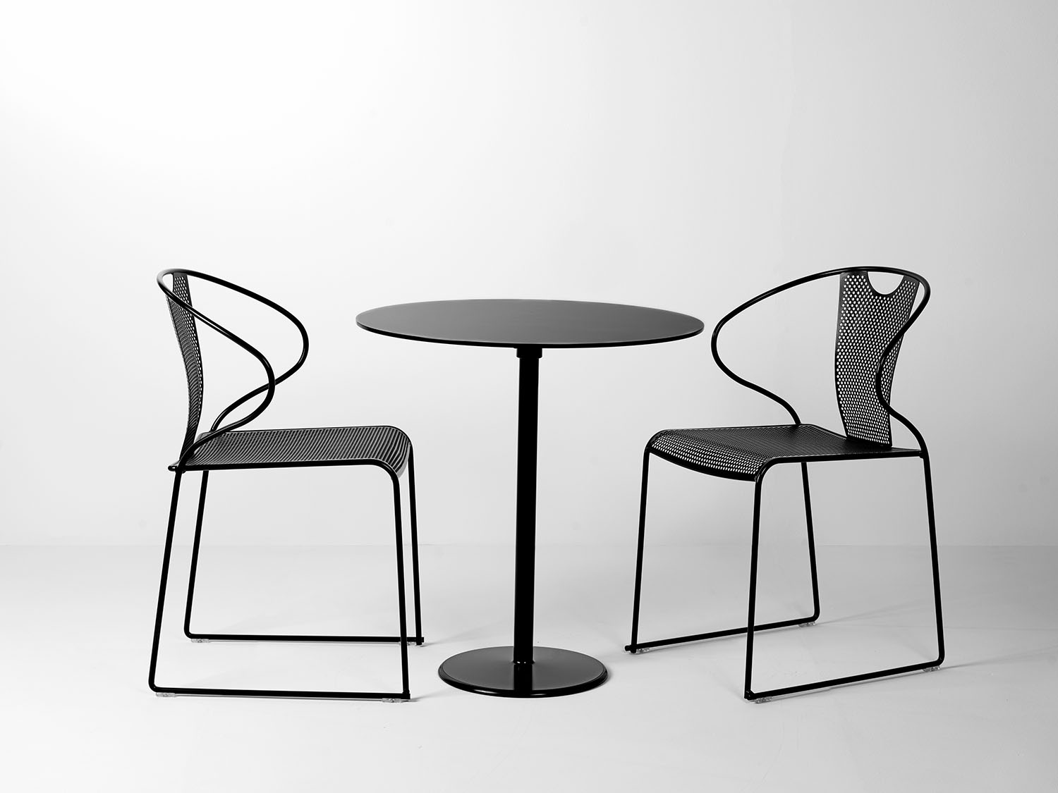 Med ett mjukt formspråk där rygg och sits ramas in av en nätt trådram upplevs denna metallstol mjuk och skön. Piazza karmstol är lättplacerad och dessutom stapelbar. Enhandsgreppet i ryggen underlättar när du kommer med kaffekoppen i handen och ska dra ut stolen för att slå dig ner. Piazza stol och bord är lätta att hålla rena då perforeringen i bordsskiva, sits och rygg gör att vatten och smuts lätt rinner av.