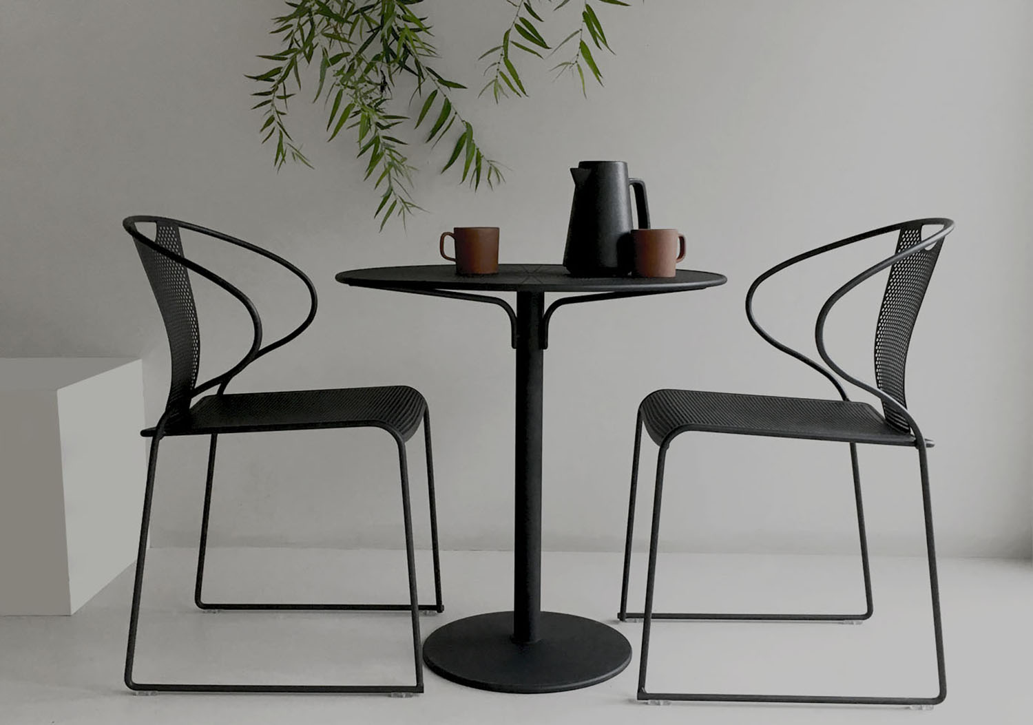 Bordet och stolarna är tillverkade i metall som lackats i en finstrukturerad pulverlack.