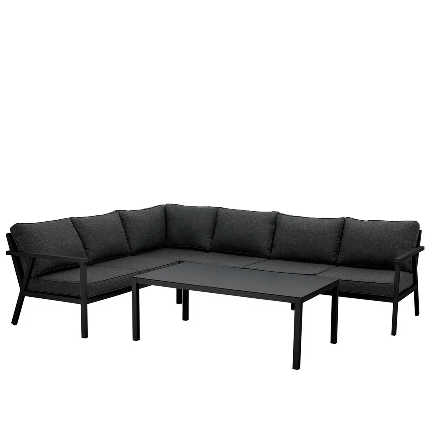Rana hörnsoffgruppp i svart inklusive svarta dynor och soffbord.