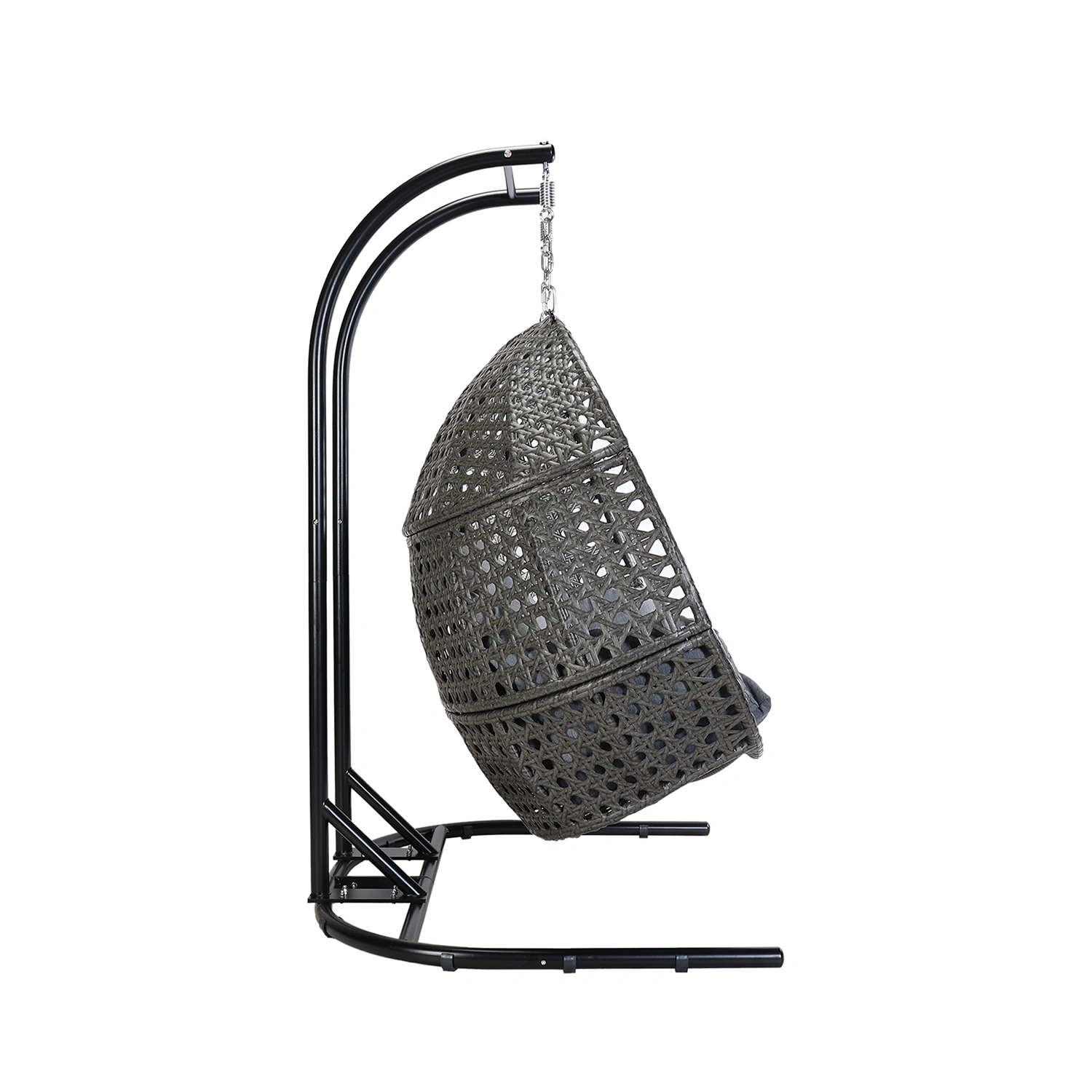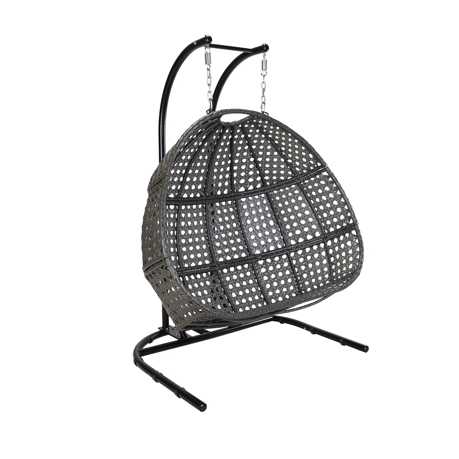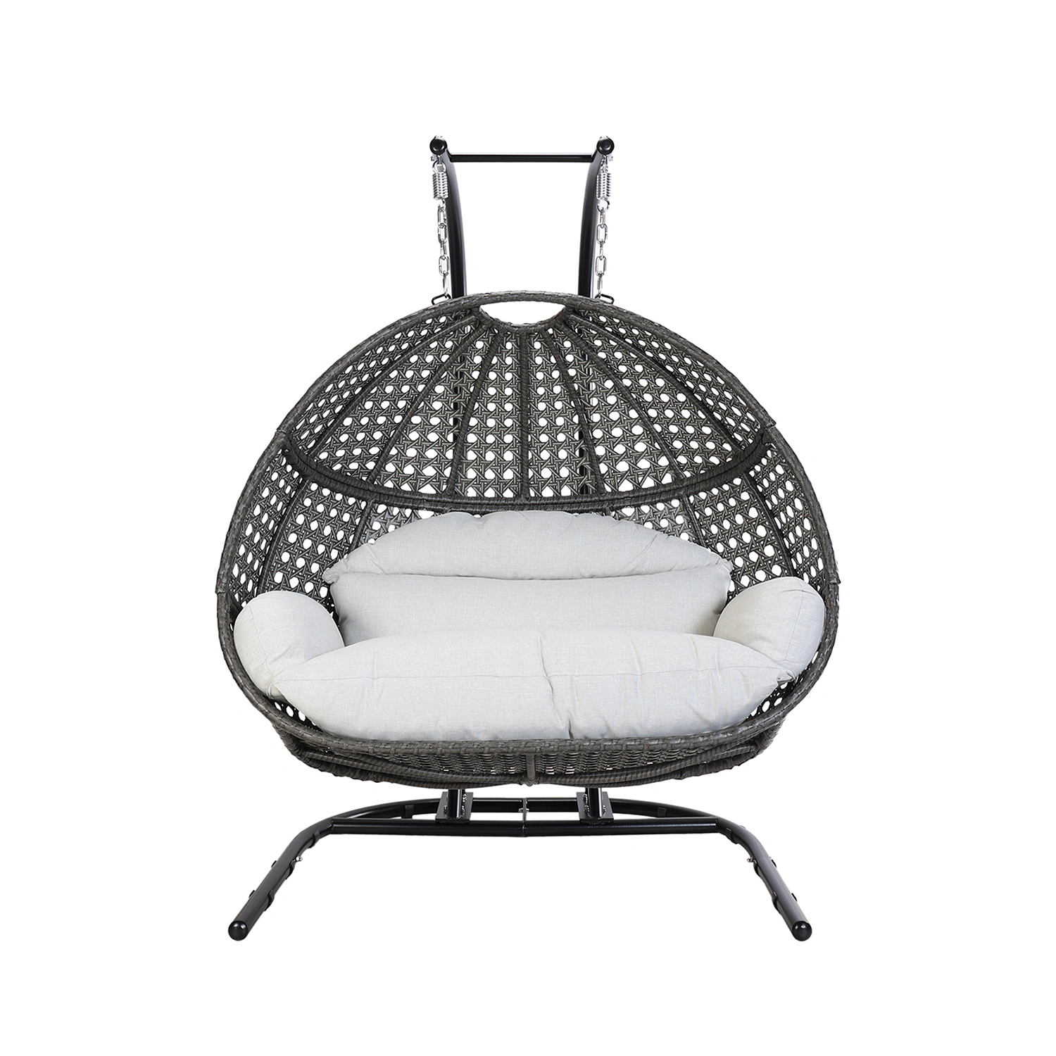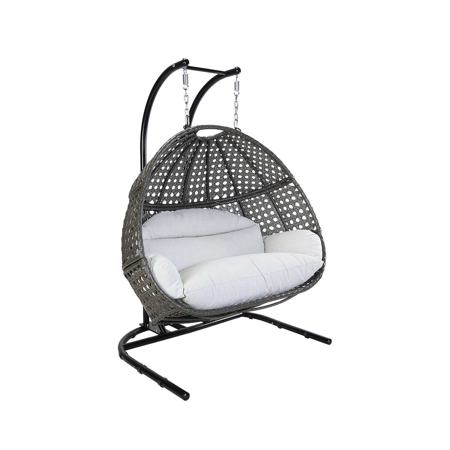 Hänggunga med plats för två personer. Gungan är tillverkad i stål med flätning i konstrotting, stativet i svartlackerat stål. Dynor i beige Olefintyg ingår.