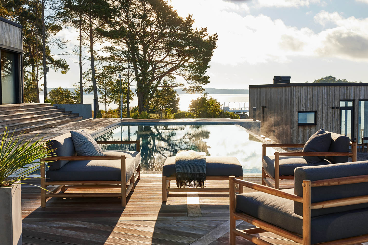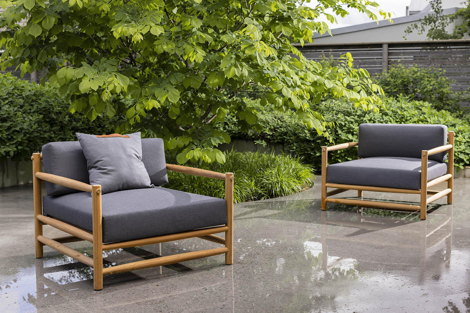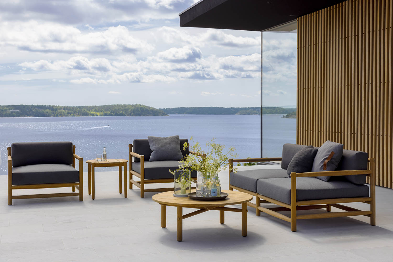 Saltholm fåtölj är en lyxig loungestol där teakramens återhållsamma design balanseras av böjda, frodiga kuddar.