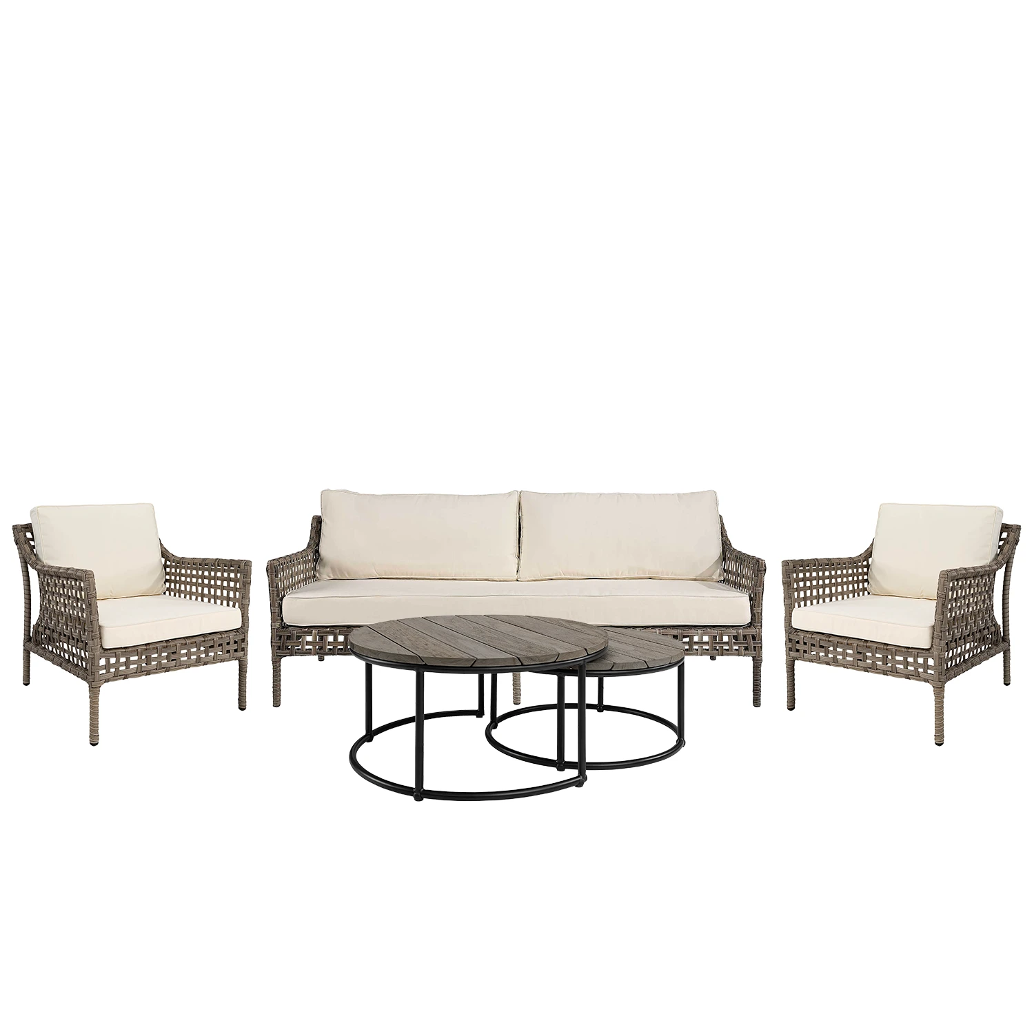 Santa Monica är tillverkad i en bred, väderbeständig konstrotting som kallas ”Classic Grey” med en stomme i aluminium. Dynor med vit avtagbar klädsel i 100% polyester ingår. Det går även att lägga till extra dynklädslar i andra tyger.