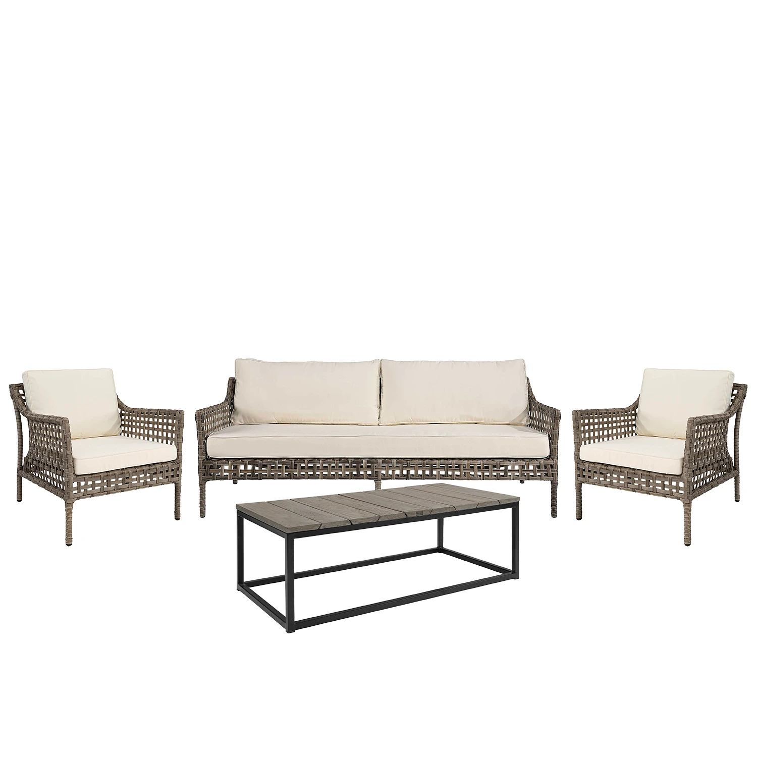 Soffgrupp från Artwood med Santa monica soffa och fåtöljer i konstrotting och soffbordet Anson i teak/stål.