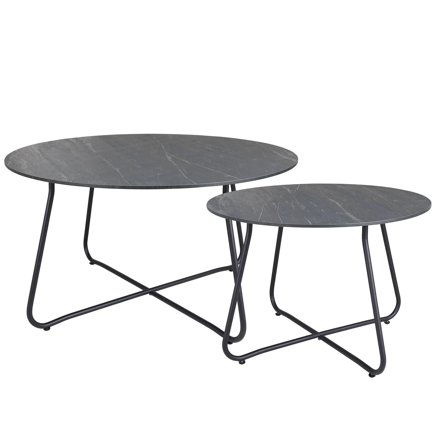 Taverny satsbord med två runda, tåliga bord i aluminium. Detta satsbord har robusta stålstativ med bordsskiva i antingen aluminium eller laminat, båda material som är utformade för att tåla väder och vind. Visas här med laminatskivor med mörkgrå, melerad stenlook som standardval.