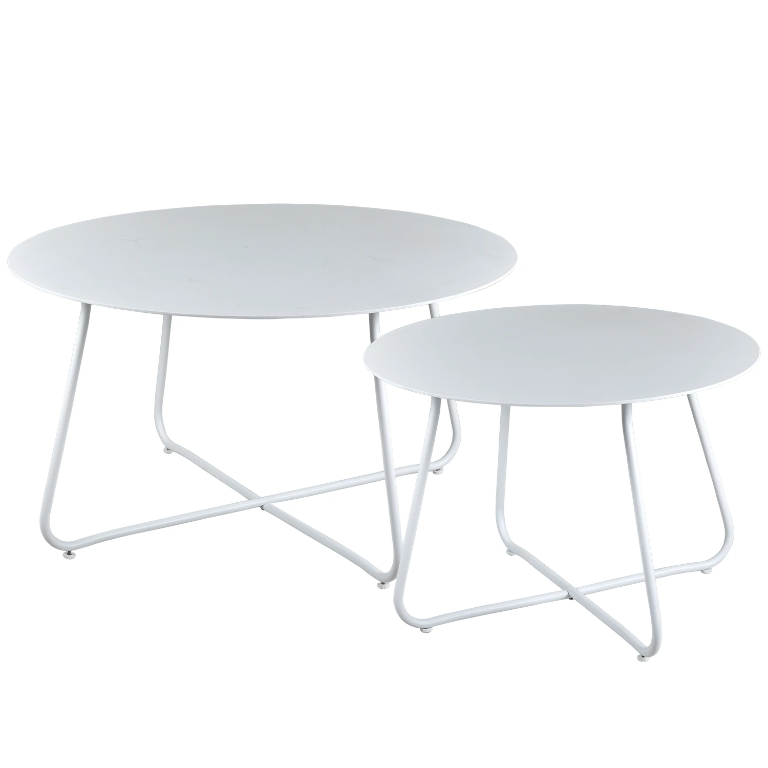 Taverny satsbord med två runda, tåliga bord i aluminium. Detta satsbord har robusta stålstativ med bordsskiva i antingen aluminium eller laminat, båda material som är utformade för att tåla väder och vind. Visas här med vita aluminiumskivor som standardval.
